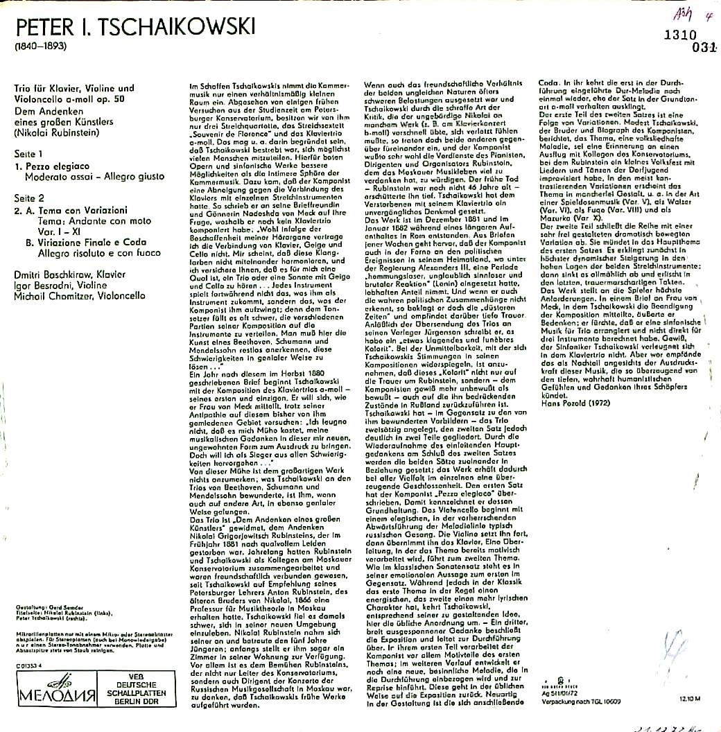 商品コード:1310-031t[ETERNA] D.バシュキーロフ(pf) I.ベズロードヌィ(vn) M.ホミッツァー(vc) / チャイコフスキー:Pfトリオ