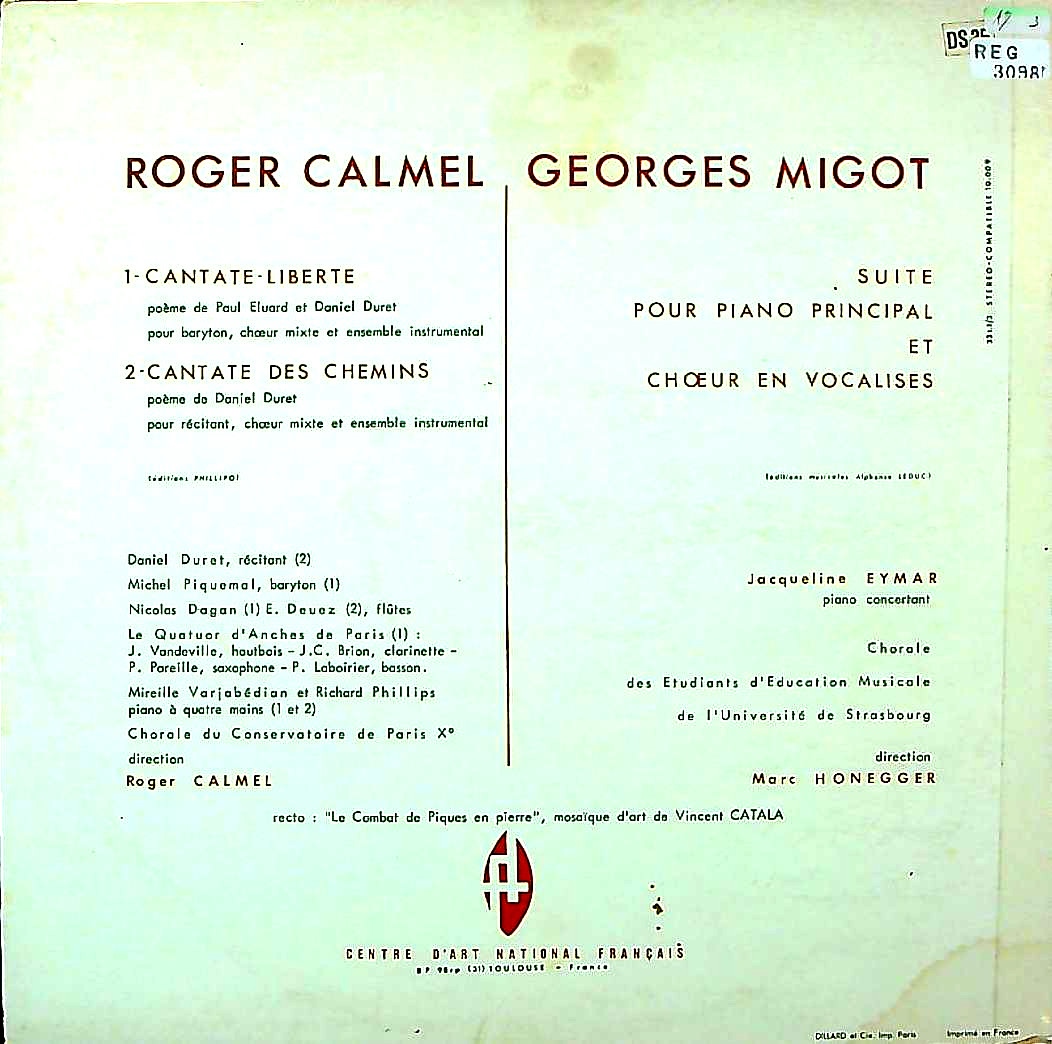 演奏者:R.カルメル指揮パリ木管Qt., パリ第10音楽院cho., N.ダガン, E.デュエツ(fl)M.ヴァルジャベディアン, R.フィリップス(pf)M.ピクマル(br)/J.エマール(pf)M.オネゲル指揮ストラスブール大学音楽教育学生cho.