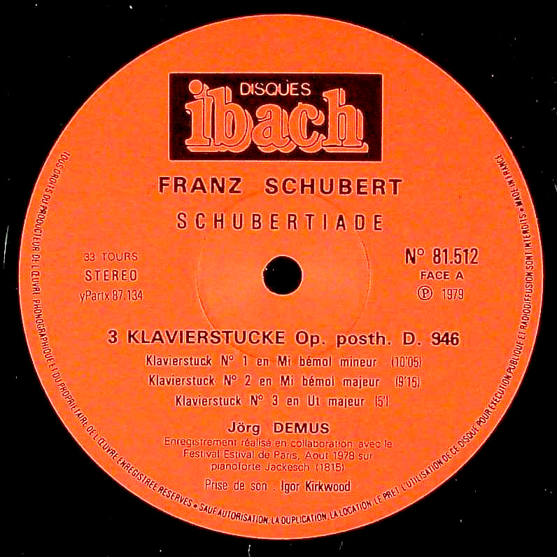 作品名:「デムス・シューベルティアーデ」シューベルト:3つの小品D.946, Pfソナタ13番D.664, 12のレントラーD.790, 6つのドイツ舞曲D.145, 最初のワルツD365~12曲, アレグレットD.915, ディアベリワルツによる変奏曲D.718~主題, アダージョD.612, スケルツォD.593, 即興曲Op.90-3, 3つのドイツ舞曲D.973-2