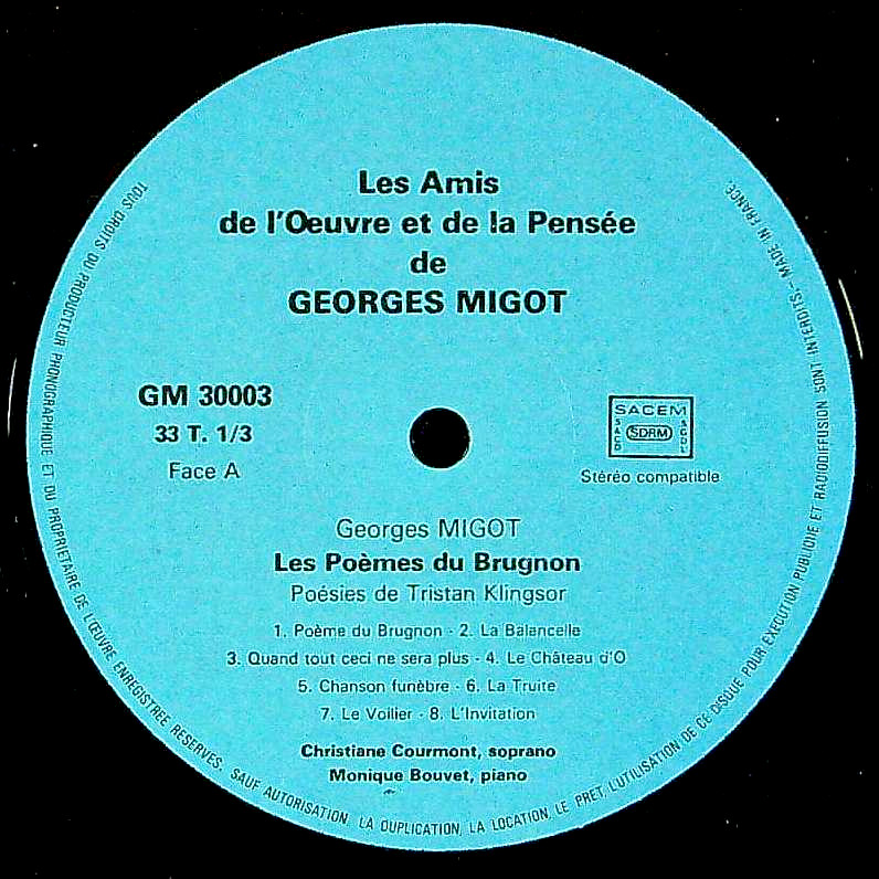 トピックス:水色/黒GG, ツヤ, 「Les Amis de l'Oeuvre et de la Pensee de Georges MigotLes Poemes(ジョルジュ・ミゴーの作品と思想の友人たち)」によるプライベート盤, T.Klingsorの17の詩による歌曲集
