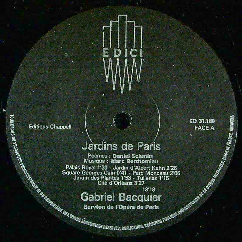 作品名:「パリの庭園~バキエ歌曲集」ベルトミュー:パレ・ロワイヤル, アルバート・カーン庭園, ジョルジュ・カン広場, モンソー公園, 植物園, テュイルリー公園, オルレアン市, モンスリ公園, リュクサンブール宮, バガテル, ヴァンセンヌ, ビュット・ショーモン公園, ブローニュの森 (全13曲)