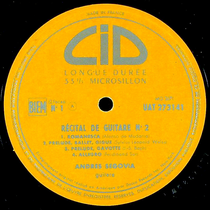 トピックス:橙/銀外溝GG, 折返表ツヤ, 米ニューヨーク録音, 米DECCA録音, 「セゴビア・ギター・リサイタル」全3枚完結の中巻, No.1(UAT 273029)No.3(UAT 233142)