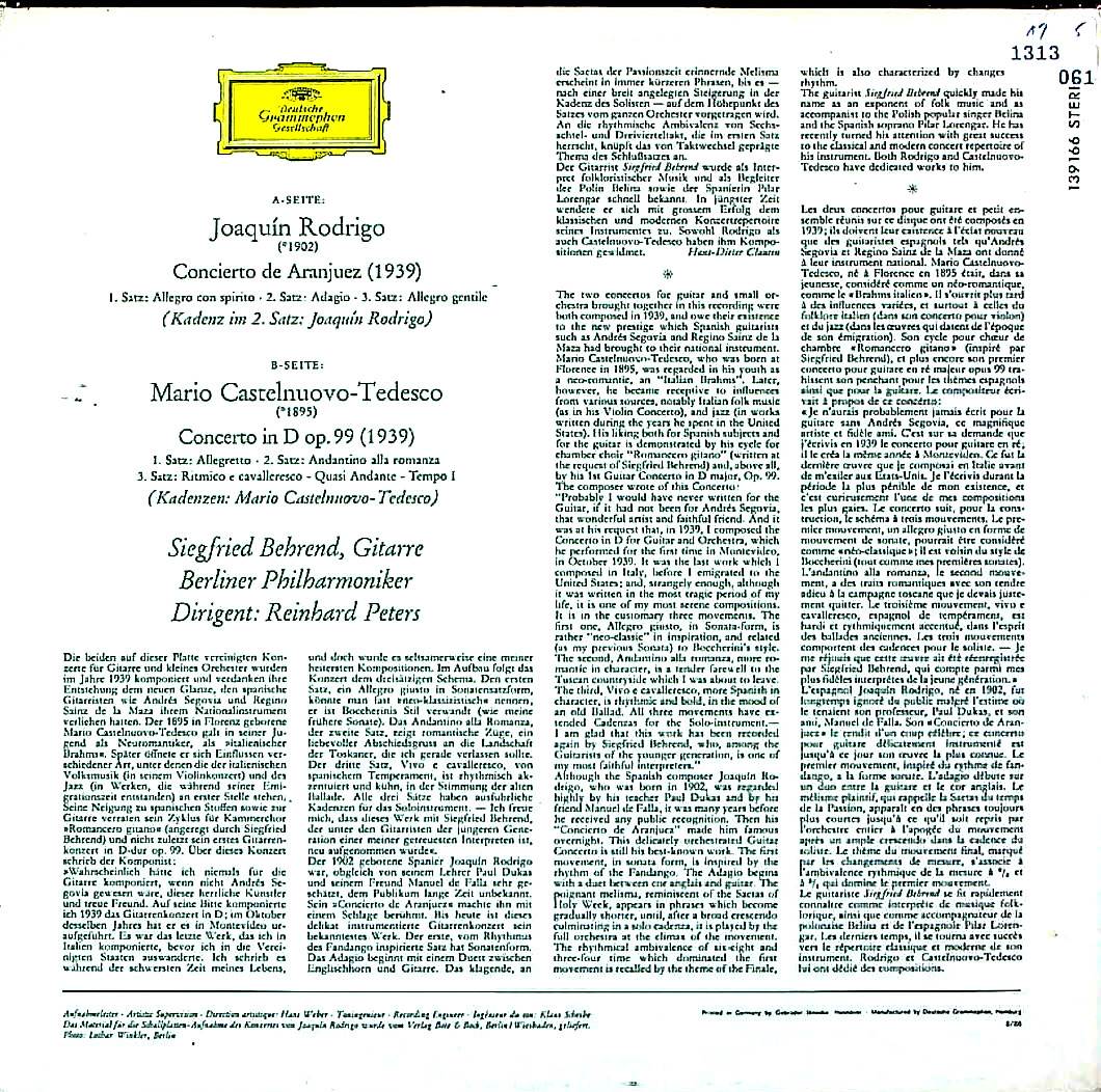 商品コード:1313-061[DGG] S.ベーレント(gt)/ Gt協奏曲/ロドリーゴ, カステルヌオーヴォ・テデスコ