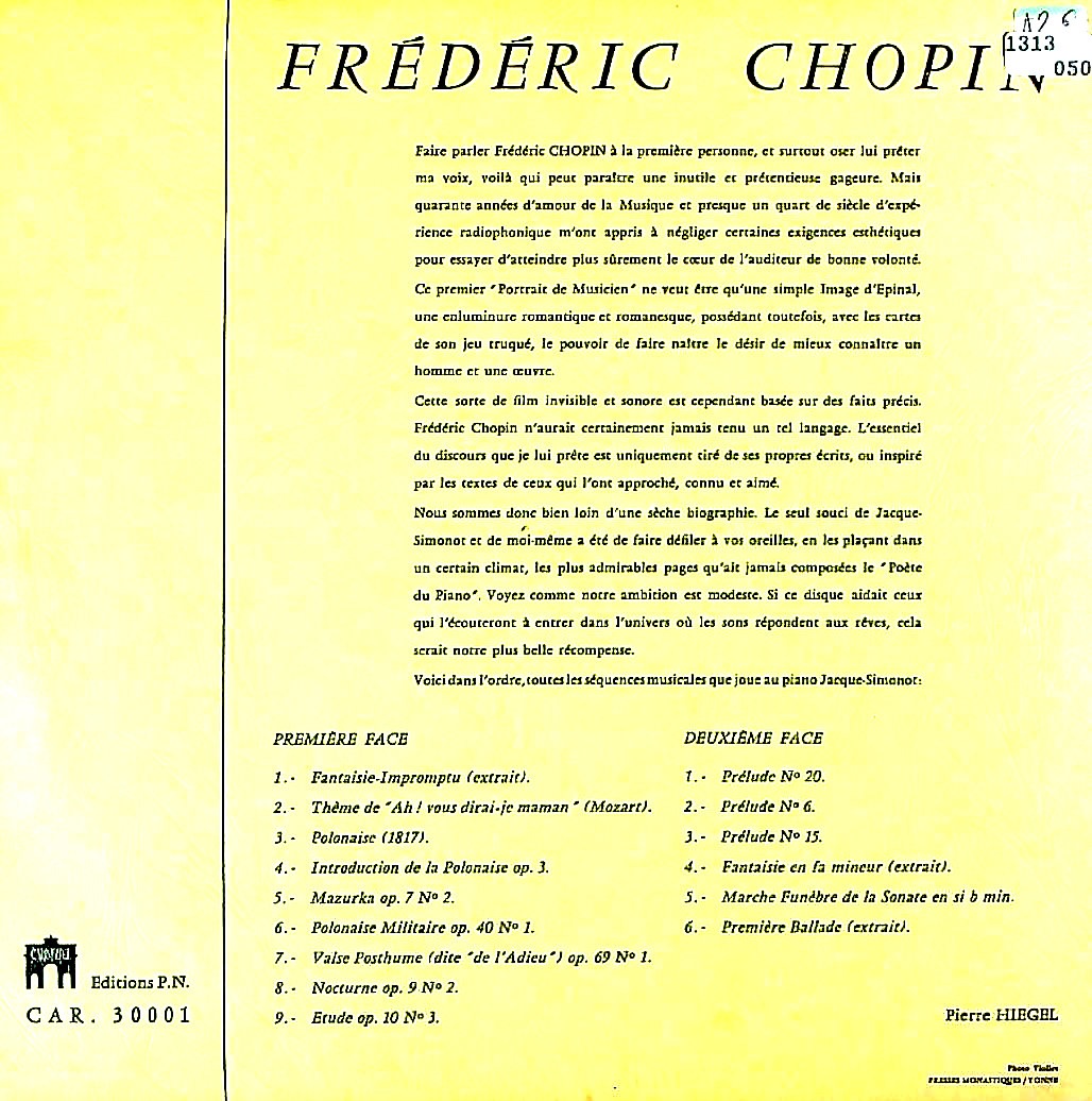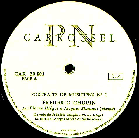 商品詳細:1950年代後期に発売されたマイナーレーベルから出たショパン作品集だが、一般のピアノ曲ではない。ミュージシャンの肖像シリーズ-1「ショパン」の表題の通り、ピアニスト一人と男女一人ずつ二人のナレーターによる「ショパン物語」が展開される構成のLPである。親会社はÉditions Carrousselでポピュラー系のレーベルでありクラシックは1~2点ほどしかないようである。ピアノのジャック・シモノー(1912-1961)はフランス・ディジョン生れの作曲家、歌手、ピアニスト、オルガニスト、バンドリーダーなどの分野で活動した人物。音楽活動はクラシックに限らず、自身が創設したジャック・スミントン・オーケストラなるバンドで1950年代にダンス音楽などを演奏している。それらのLPも出ている。男声ナレーターのピエール・イエージュル(1913-1980)はシャンソン系の歌手でSPで録音を出していた。女性ナレーターのナタリー・ネルヴァル(1926-2012)はパリ生まれのフランス人 女優で 25 年近く(1977 年から 2001 年まで)コメディ・フランセーズで舞台を踏んだ。また多数の映画出演、テレビ出演を果たしている。3人共フランスでは著名だった業界人であり、有名な3人が演した「ショパン物語」はそれなりに需要のあった内容だったと思われる。ピアノだけを聴きたい方には不向きなLPだが、ナレーションを交えることでショパンの伝記映画の音声部分が楽しめる志向になっている。シモノーのピアノはパリ音楽院系を彷彿とさせる情緒豊かなもので非常に上手い。何故か2曲だけにモーツァルトの「きらきら星変奏曲」が入るが、展開上必要だったのだろう。なお曲目では全曲演奏を意味するものだが、最後まで演奏する曲はなく一部に留まるので注意。作曲家紹介のLPに見られる他のLPと同様である。
