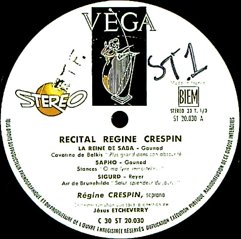 商品詳細:豪華版シルク張り三方開ジャケットに入った、クレスパンのリサイタル。録音は'61年パリ。故デュマゼール氏の企画。C30X 318/C30ST 20030という番号からも解かるように、特別な企画でもあったようだ。指揮のエチュヴェリはVEGAのオペラ専属指揮者で、多数の全曲盤を入れている。それだけにオケは安定している。クレスパンの声は実に伸びやかで清々しい。どれか一枚とお考えの方にはぴったり。内にカラーの大きな写真が印刷されている。これまでモノラルが数回入荷しただけであったためモノラル録音と考えていたが、今回初めてステレオが入荷してステレオの存在を確認した。レジーヌ・クレスパン(1927– 2007 )はフランス・マルセイユで生まれのソプラノの歌手。19歳でパリに行き、パリ音楽院でスザンヌ・セボン=ヴィズール、ポール・カバネル、ジョルジュ・ジュアットらに師事。1950年アルザスのラン国立オペラ座と契約した。1951年にパリ・オペラ座からオファーを受け契約に至る。しかし1年で打ち切られ、1952 年にパリを離れ、フランス各地のオペラ・ハウスで演奏した。彼女はマルセイユ、ニーム、ニース、リヨン、ボルドー、トゥールーズなどで歌った。1955年、カール・マリア・フォン・ウェーバーの『オベロン』のレジア役でパリ・オペラ座に戻った。パリの聴衆に熱狂的に迎えられ、クレスパンはその後3年間、ジュゼッペ・ヴェルディの『オテロ』のデズデモーナ役、ヴェルディの『仮面舞踏会』のアメリア役、 『シグルズとマダム』のブリューネヒルト役などパリの舞台で凱旋公演を続けた。1957年のフランシス・プーランク作『カルメル会修道士の対話』のパリ初演などに出演。1958年からはワーグナーをドイツ語で歌う為にレッスンを重ね、ドイツ語の役もこなし、国際的なオペラのキャリアを事実上スタートさせた。スカラ座、ウィーン国立歌劇場、グラインドボーン音楽祭と1960年のロイヤル・オペラ・コヴェント・ガーデンでのデビュー、1962年頃は米国デビューも果たした。1960年代はメトロポリタン歌劇場での数年間、国際的なオペラの舞台で活躍し続けた。1970年代に入ると声の変化に適応するためにメゾ・ソプラノ歌手のオペラ役を演じ始める。彼女の声の音色は初期の歌手時代からあまり変わっておらず、したがって彼女はこれらの役に典型的なメゾ・ソプラノの音とは異なる音をもたらした。とにかく、彼女は新しいレパートリーの選択で好評を博した。1989年に歌手活動を引退するまで多くの舞台で活躍し、録音も残した。フランス語は勿論、イタリア語、ドイツ語を完全に操り、よく伸びる温かく美しい声で多くのファンを魅了した。歌曲の上手い不世出のソプラノだった。これはVÉGAでしか出てない珍しいVÉGA録音である。勿論ステレオは初入荷の超希少盤!