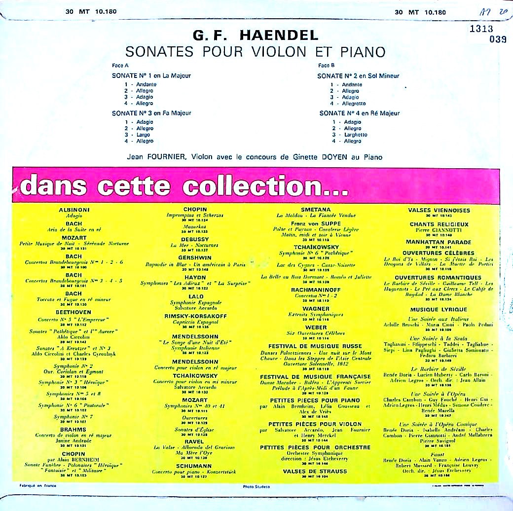 商品詳細:知られざるソナタ録音。もちろんVEGAオリジナル。Op.1から最初の4曲を収録。フランスの生んだヴィルトーゾ2人のデュオ。チェンバロ伴奏が多いこの曲だが、G.ドワイヤンのピアノがまた良い。J.フルニエは、Westminsterでの印象が強いが、ここでのスタイルが本当ではないだろうか。穏やかな表情で、決してきつい音を出さず、静かに曲の内部へ入ってゆき、個を殺し、自身が見たものをそのまま色を付けずに弦に乗せる。これが飽きのこない演奏になる!スーパーレア!! 尚ヘンデルのVnソナタは時期により考え方が異なる。現在ではヘンデルのVnソナタはOp.1の中の6曲で順番にOp1-3/10/12/13/14/15となる。これはクリュザンダー版(1879年)の作品1の通りである。Op.1は全部で15曲あり、これら6曲以外はVnソナタではない。録音当時のVÉGAもこれに従っていると思われる。クリュザンダー版のOp.1に含まれないVnソナタも4曲存在するのでそれらが混同されていないか見る必要がある。VÉGAのJ.フルニエ(vn)/G.ドワイヤン(pf)の録音は込み入っており、1950年代にリリースされたC30S 182には2/3/5/6番の4曲が収録されている。1960年代に出たこの30MT 10180には1/2/3/4番の4曲が収録されており、オリジナル/再版の関係ではない。また別に7"が今のところ3枚確認されており、ソナタ1番:C37A 39/ソナタ2番:C37A 40/ソナタ6番:C37A 44である。ここで6曲は2枚ある12"の何方かに必ず含まれることを確認した。但し2・3番の2曲は両方に含まれるので30MT 10180は再版ということになるが1/4番はC30S 182には含まれず、4番は7"も存在しないようである。そうなるとこの場合、12"は2枚ともオリジナルということになる。2枚ないと全6曲揃えることが出来ない。1950年代初期からWESTMINSTERでフランスから参加して多くの名演といえる録音を残した夫婦デュオのヘンデルは珍しくもあり音楽性の高さは群を抜くものがある。ジャン・フルニエの程好くヴィブラートがかかり抑えた表情で聴くヘンデルもまた絶品である。C30S 182をお持ちの方に紹介したい。この30MT 10180がないと1・4番が漏れてしまうので注意!結局12"のC30S 182と30MT 10180の2枚で6曲が揃う。但し2/3番はダブるが致し方ない。それがアナログという物である。