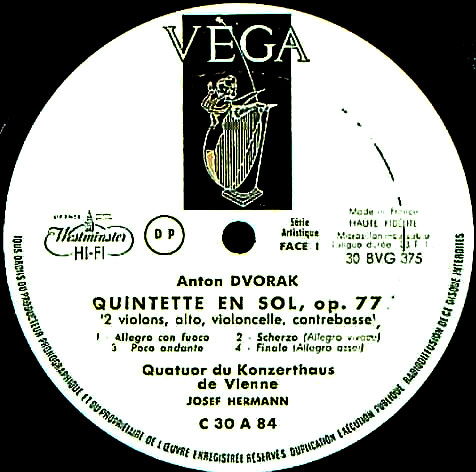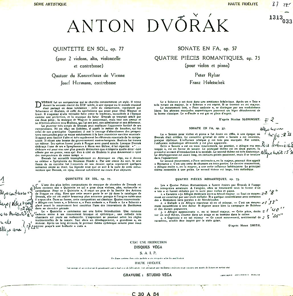 商品コード:1313-033[VÉGA] ウィーン・コンツェルトハウスQt. P.リバール(vn) 他/ ドヴォルザーク:弦楽五重奏曲2番, Vnソナタ 他