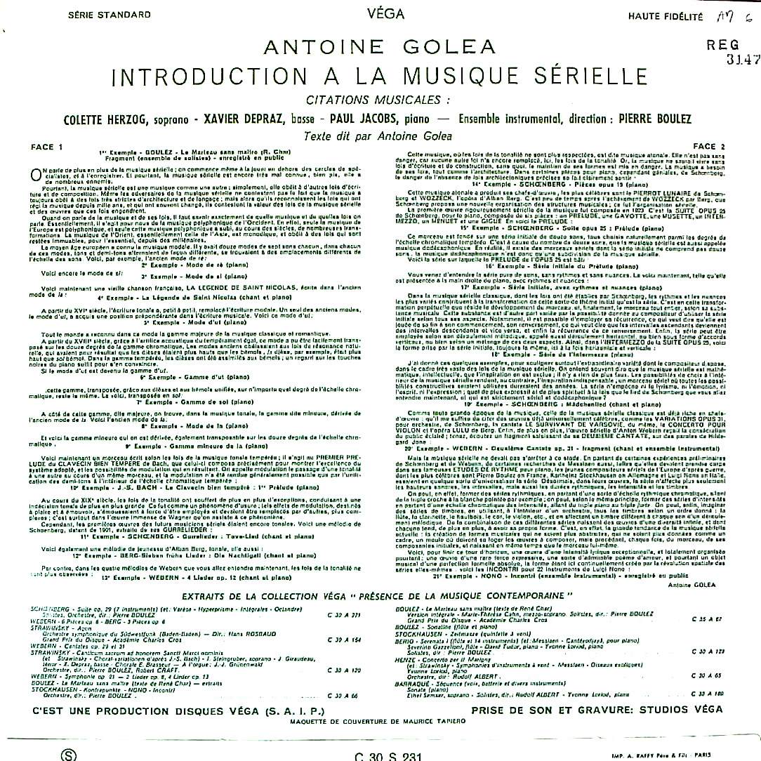商品コード:REG-3147[仏VÉGA] C.ヘルツォグ(s) X.デプラス(bs) P.ヤコブス(pf) P.ブーレーズ指揮 / A.ゴレア:イントロダクション・ア・ラ・ムジク・セリエール