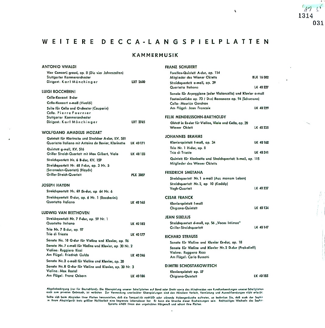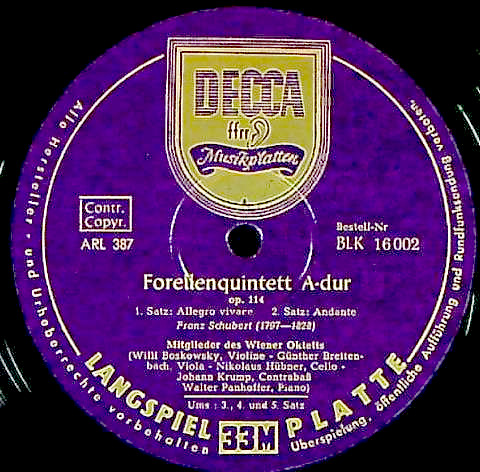 商品コード:1314-031p[DECCA] W.パンホーファー(pf) ウィーン八重奏団メンバー/ シューベルト:Pf五重奏曲「鱒」