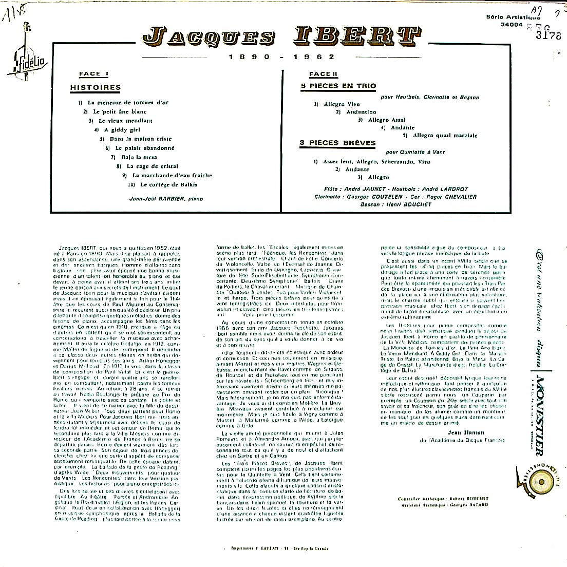 商品詳細:バルビゼではなくバルビエ。このピアニストはサティしか弾かないと思っていたが、イベールを録音していた。フランス風エスプリの作風なので、プーランクやフランセが好きな人には、間違いなくお薦めできる。片面はピアノが入らない管楽のための室内楽曲2曲。こちらの方がイベールの作風をよく反映している。それにソリストも名手揃いだ。ステレオだが古い録音なので、ハルモニア・ムンディのような香り立つような音は望めないが、雰囲気の良い音がする。(MK)