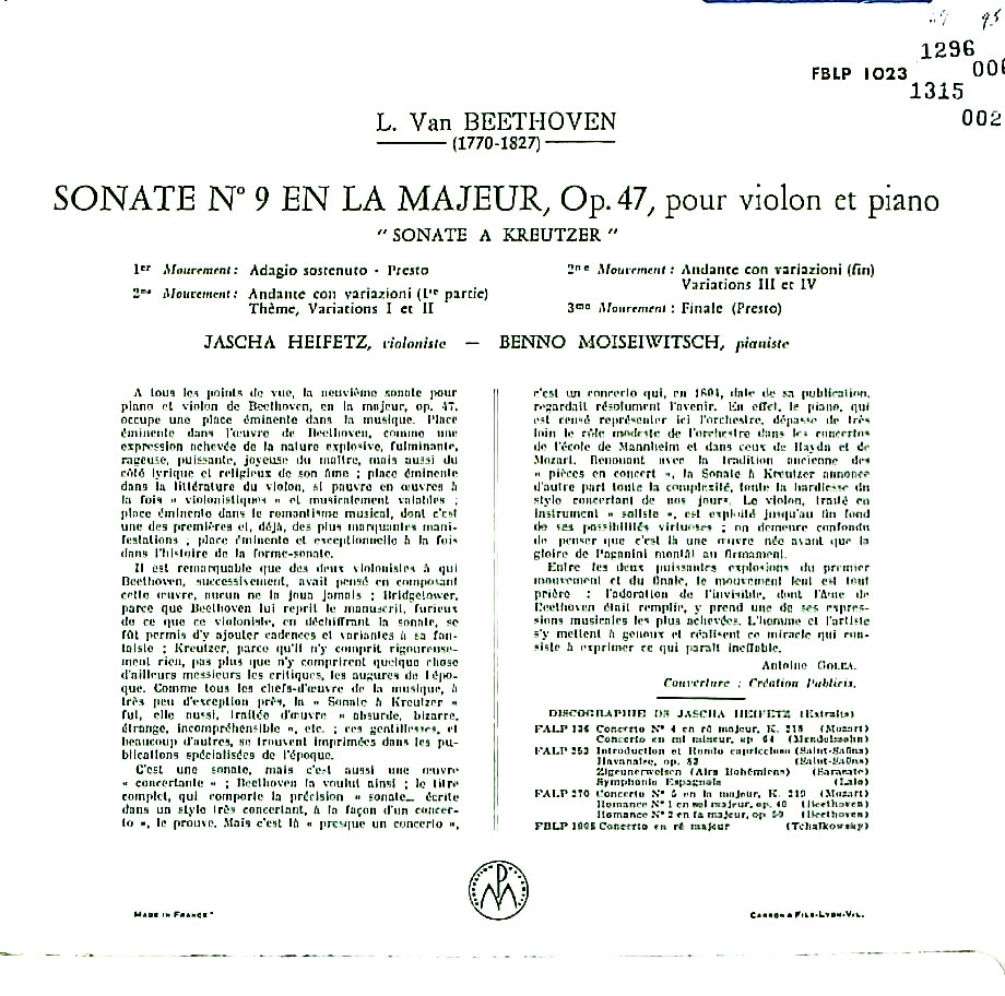 商品コード:1315-002[La Voix De Son Maître] J.ハイフェッツ(vn)/ ベートーヴェン:Vnソナタ9番「クロイツェル」