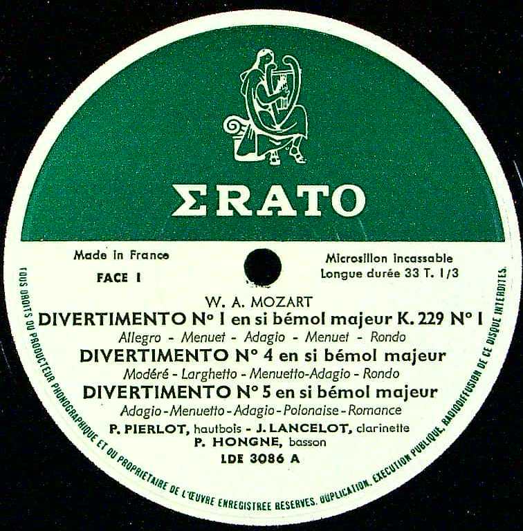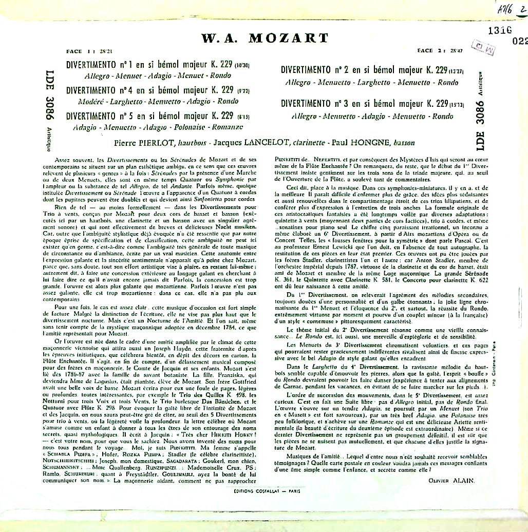 商品コード:1316-022[ERATO] P.ピエルロ(ob) J.ランスロ(cl) P.オンニュ(fg) / モーツァルト:木管三重奏のための5つのディヴェルティメント(全5曲)