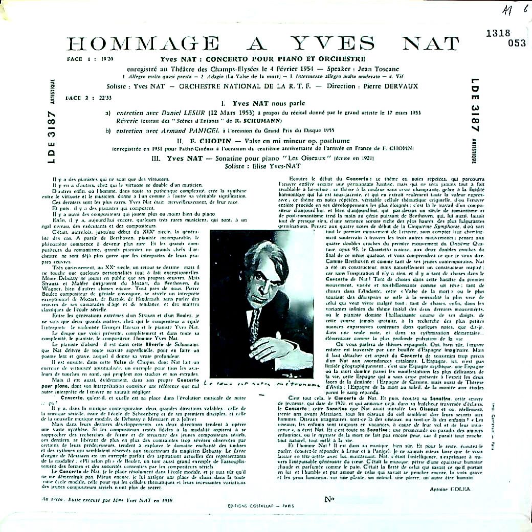 商品詳細:A面は1954年パリ・シャンゼリゼ劇場でのコンサートで始まる、自作の協奏曲。ナレーションが流れた後(リアルな声だ)長い拍手が入り、ピエール・デルヴォー指揮のオケが入る。これがまたひどくリアルな音で驚かされる。曲調は現代曲で、ソロもジャズ風の速いパッセージが続く。トライアングルと金管の音がそこで鳴っているようだ。B面は1953年の長いインタビュー(太く低い声)があり、ダニエル・レスールへのインタビューというトラックの最後にシューマンの「トロイメライ」が演奏される。次のトラックがアルマンド・パニゲルへのインタビューでここではショパンのワルツ14番遺作が演奏される。ここでB面の中央、最後の長いトラックはナット作のソナチネ「鳥」が演奏される。A面の協奏曲であまりシンパシーを感じなかった方にはこのピアノソロ作品が面白い。忙しい指使いで始まるこの自作は指回りはそのままにやがて幻想的な曲調になり美しいメロディーと不思議な間を持った方向へ展開してゆく。音が非常に多く雨がメロディーを奏でるような雰囲気である。非常に長いこのソロ作品はナットの音楽観を表している。ベートーヴェンをあれだけ美しく演奏するピアニストの心情がここで見え隠れする。ロマンチックであり、しかも相当に高度な技術の上に成立しているこの不思議な曲には、一人の人間が演奏しているとは思えない多種の要素が見える。このLPで最も重要なトラックであり、この世に一つしかない貴重な録音!イヴ・ナット(1890-1956)の追悼盤!イヴ・ナットはフランス・ベジエ生まれのピアニストで彼の国際的な活動は、1909年にドビュッシーに連れられた渡英に始まる。ヨーロッパやアメリカ各地で演奏旅行を行い、ベートーヴェンやシューマンの演奏で評価された。ヴァイオリニストのジャック・ティボーやジョルジュ・エネスク、ウジェーヌ・イザイらとも頻繁に演奏旅行を行っている。1934年に、母校パリ音楽院での教育と、自らの作曲活動に集中するため、演奏活動を退く。亡くなる1956年まで、パリ音楽院の指導的教師の一人として、ジュヌヴィエーヴ・ジョワやピエール・サンカンらを育てた。一方1950年代にはピアノの演奏活動を再開、1951年から1955年にかけてベートーヴェンのピアノ・ソナタの全曲録音を実現させた。ダニエル・バレンボイムはナットについて「すぐれたピアニストだったと私は思うが、フランス国外ではあまりに過小評価されていた」と述べている。フランスのピアノ楽壇にマルグリット・ロンにも劣らない貢献を残した偉大な音楽家であった。この作曲家としてのイヴ・ナットに注目したLPだが、シューマン:トロイメライ(1955年録音)やショパン:ワルツ14番(1931年録音)等の当LP独自の録音も聴ける盤!最後の自作のソナチネ「鳥」を弾いているのはイヴ・ナットではなくエリーズ・イヴ・ナットで彼の奥さんではないかと思われる。