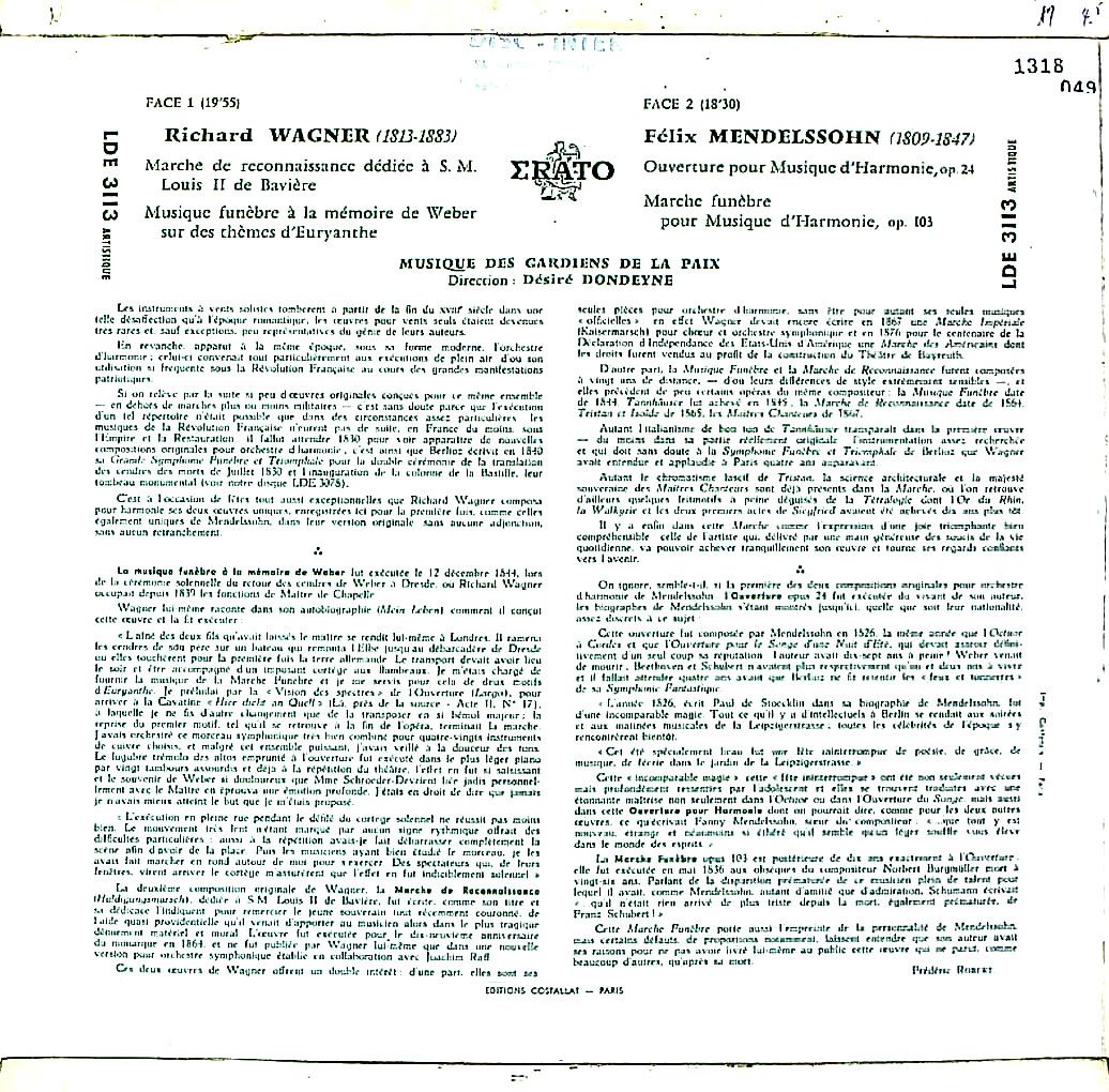 商品詳細:D.ドンデーヌ指揮パリ警察音楽隊といえばベルリオーズ:葬送と勝利の交響曲の録音で知られるフランス随一の軍楽オーケストラである。ここではやはりワーグナーとメンデルスゾーンが作曲した軍楽作品の計4曲が収録されている。殆ど演奏されることのない曲であり、LPではこれが初の録音かもしれない。DECCAも盛んに軍楽オーケストラのLPを発売したが、フランスではERATOが積極的であった。とはいってもD.ドンデーヌ指揮パリ警察音楽隊の録音はERATOに全部で3点ほどである。DECCAからも発売されたようである。通常のクラシック音楽と異なり、警察組織にある軍楽オーケストラ以外で演奏されることはない特殊作品。しかしこのような作品をワーグナーもメンデルスゾーンも書いていたとは驚きである。ワーグナーの曲は一瞬でワーグナー作品とわかる雰囲気を持っている。通常の管弦楽団が演奏しても全く違和感のない曲である。メンデルスゾーンの曲も静かに始まる管弦楽曲で、こちらも通常の管弦楽曲の扱いでおかしくない曲である。それでも軍楽オーケストラ以外では演奏されない点からも特別なジャンルとしての扱いの対象なのだろう。このLPは敢えて軍楽オーケストラのための作品集とはせずに、あまり取り上げられない「管弦楽曲集」という扱いで全く問題がないほど、通常のクラシック音源である。演奏が軍楽オーケストラというだけで、演奏は全く軍隊風な所は感じられない。珍しいワーグナーとメンデルスゾーンの「管弦楽曲集」と思っていただいて問題ない。全体に静かな音楽であり、決してうるさい演奏ではない。ステレオ:STE 50016もあるが入荷はない。
