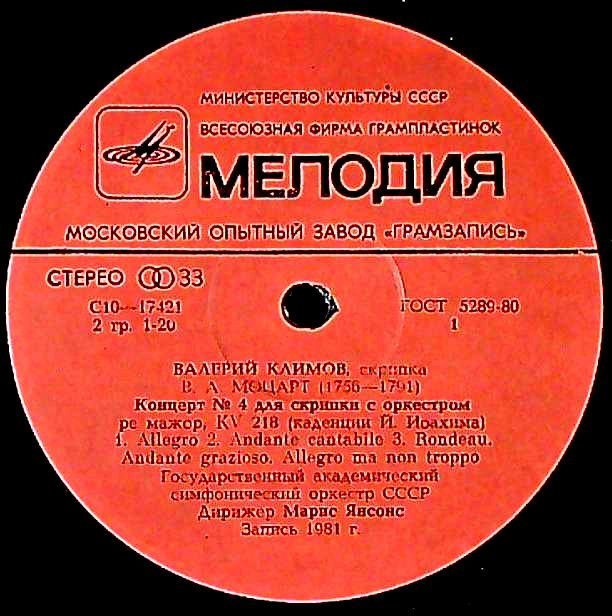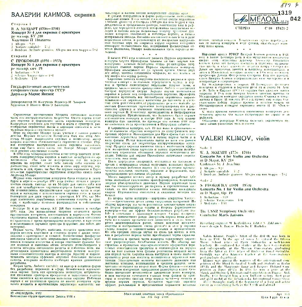 商品コード:1319-042n[MELODIYA] V.クリモフ(vn) M.ジャンソン指揮/ Vn協奏曲/モーツァルト:4番, プロコフィエフ:1番