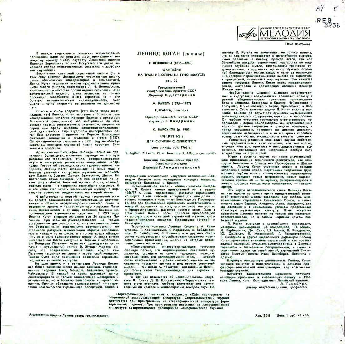商品コード:REG-3256[露MELODIYA] L.コーガン(vn)/ ヴィエニャフスキ:ファウスト幻想曲, ラヴェル:ツィガーヌ, バルスコフ:Vn協奏曲2番