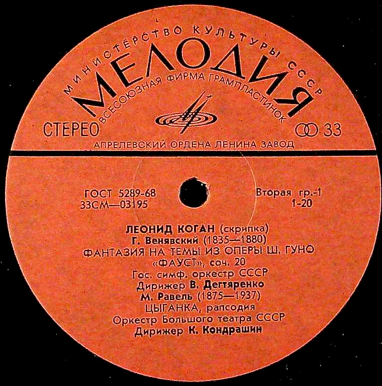 演奏者:L.コーガン(vn)V.デグチャレンコ指揮ソビエト国立so./K.コンドラシン指揮ボリショイ劇場o./G.ロジェストヴィンスキー指揮ソビエト放送o.