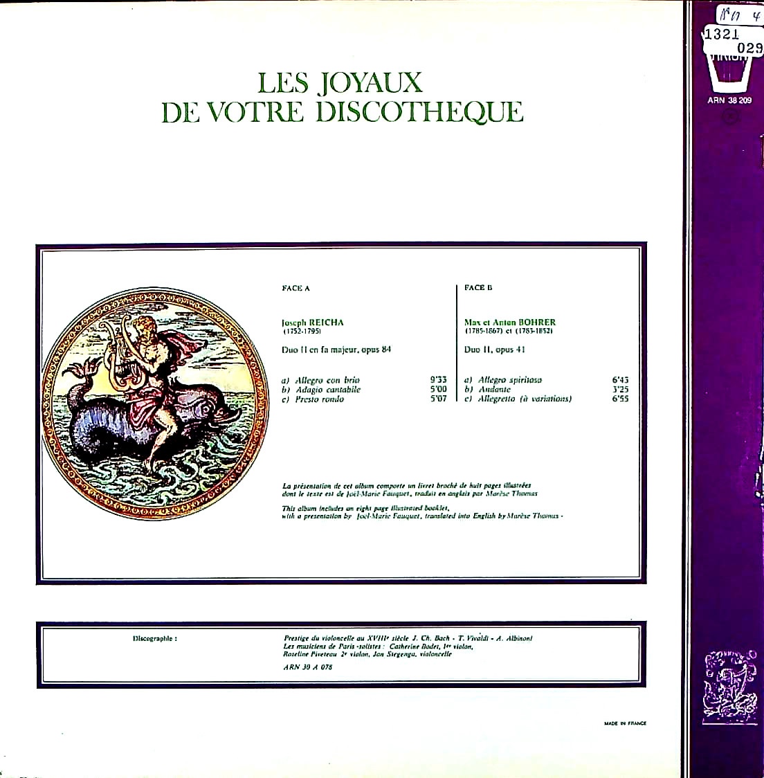 商品詳細:VnとVcのデュオ曲2曲収録。デュオ・コンチェルタンテと書いてあるが、オケは付かない2重奏。2曲とも明るい曲想で、2台の楽器の妙が楽しめる。ピアノが入らないので、楽器の音がストレートに肌に伝わる。日本では無名の2人だが、ARIONレーベルに録音する演奏家達のレベルは高く、2台とも朗々と楽器を鳴らし、快い。アントニーン・レイハ( 1770 - 1836)はチェコ出身の作曲家、音楽理論家。フランス及びドイツでの活動が長かったことから、フランス名アントワーヌ・ライシャ、ドイツではアントン・ライヒャとされるが当社ではアントニーン・レイハで統一している。ベートーヴェンとは同年生まれで、友人でもある。24曲の木管五重奏曲をはじめとする管楽器のための作品を多数残したため、木管五重奏曲は演奏される機会が多い。1829年、フランスに帰化した。ここではVn・Vcのための2重奏曲 ヘ長調Op.84が演奏される。B面のVn・Vcのための2重奏曲Op.41は、チェロ/コントラバス奏者であったマクシミリアン・ポーラー(1785-1867)とヴァイオリン奏者であったアントン・ポーラー(1783-1852)の兄弟による。2人は音楽家、作曲家であり、ヨーロッパ各地でコンサートツアーを行っていた。兄のマクシミリアンはシュトゥットガルトのヴュルンベルク宮廷楽団員であった。ここに収録された二重奏曲 Op.41はポーラー兄弟の共作の二重奏曲と思われる。Vnは女性でロザリーヌ・ピヴェトー、パリでG.ブリロンに師事。当初兄弟でデュオを組んでいた。CALLIOPE にも録音がある。Vcは男性でジャン・ステンヘンガ、オランダ生まれ。パリでポール・トルトゥリエに師事、オランダ室内o.のソリストになる。2人は出会い、その後結婚してVnとVcのデュオを組むことになる。それぞれ1500年代のPeter Romboutsという古楽器を使用。これは'73年の録音。