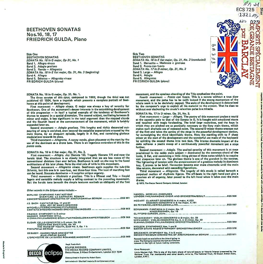 商品詳細:フランス人コレクターが個人として40年に亘って収集した演奏家別のコレクションをそのまま「コレクターズ・シリーズ」としてセットで出すことにした。当社では初の試みとなる。長年かけた厖大な時間はお金には換算できない。また縁あって集まったコレクションを散逸させず後世に受け継ぐことも国を跨いだ文化継承になるだろう。レーベルは複数にまたがり、オリジナル盤だけとは限らない、また意に沿わない国の盤が混じることもある。それらをご承知の上でご検討いただけると幸いである。基本バラセットである。今回は「フリードリヒ・グルダ-3」。フリードリヒ・グルダ(1930- 2000)はオーストリア、ウィーン生まれのピアニスト。ウィーン三羽烏の一人でジャズも演奏する鬼才で知られる。録音は1940年代後期DECCAから始まる。当初ベートーヴェン弾きとして、早い時期からベートーヴェン・ソナタ録音を開始した。DECCAのベートーヴェン・ソナタ全集はバックハウスの予定ではなかった!既にグルダは1949年から録音開始。しかしカルショウは1950年からバックハウスにも録音を与えた。グルダはグルダで当然自分の全集が出来る予定だと考え、1958年までに全曲録音を行った。しかしDECCAは11枚(22曲)のLPを発売したのみで、全集ではバックハウスを優先!グルダは1959年にDECCAを去った。グルダにとって正解だったと思われる。カルショウは個人的に気の合わない器楽奏者には冷淡だったと言われている。その為、ケンプ、フルニエら大物ソリストは1960年以前に大挙してDECCAを去っている。カルショウはセールス的にうまみの大きいオペラに比重を置いていた為とされるが真実は解らない。結局グルダは最初のベートーヴェン・ソナタ全曲録音を1967年AMADEOに行った。グルダはPHILIPS、AMADEO、DGGなどで大きな仕事を残し名実ともに一流ピアニストに名を連ねた。DECCAでは1970年代に入りeclipseという再版シリーズを設けて、過去の名演を再発売した。その際、グルダの過去音源からベートーヴェン・ソナタ録音が18曲選ばれて6枚のLPに再配置されECS 720~725の6枚連番号で出されたLPが当盤と思われる。Eclipseシリーズはこの6枚で全てと思われる。レーベル6時にSTEREOの印刷があり、ステレオを強調している。またマトリクスもZALで始まる疑似ステレオタイプだが実際は電気処理なしのモノラルであることを確認した。LPとして愉しむのに不足のない、太く、影を引く音が入っている。