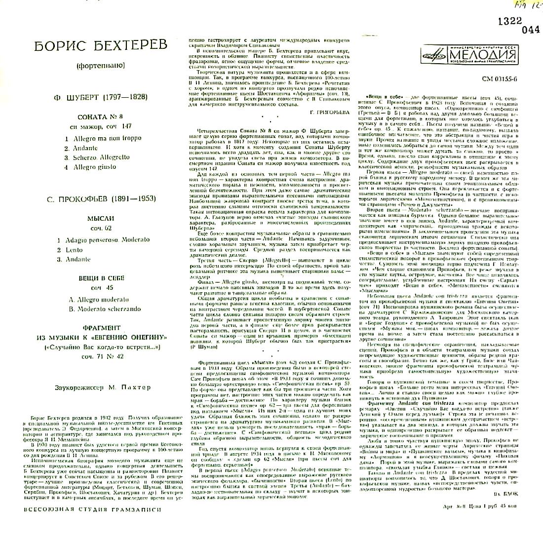 商品コード:1322-044n[MELODIYA] B.ベフテレフ(pf) / シューベルト:Pfソナタ9番, プロコフィエフ:思考 他