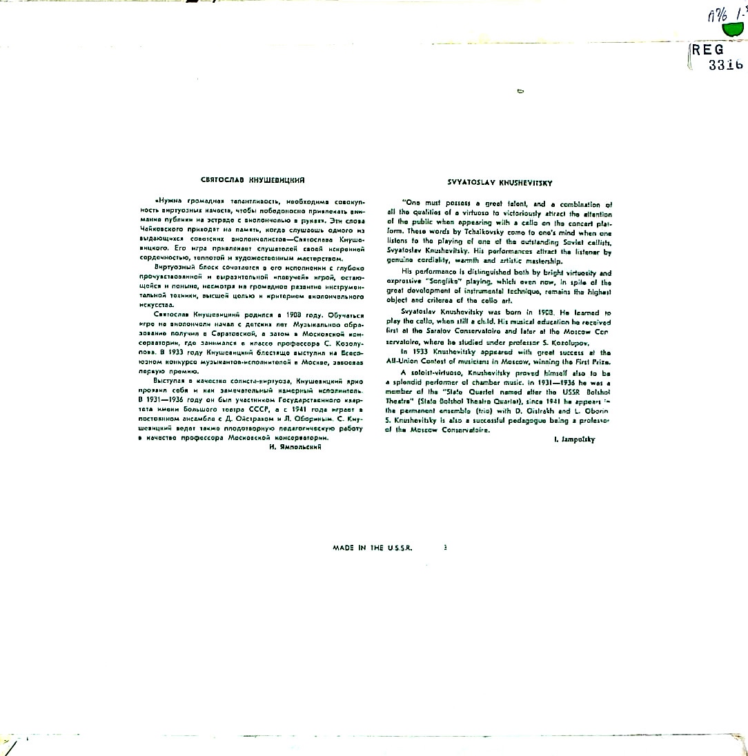 商品コード:REG-3316[露MELODIYA] S.クヌシェヴィツキー(vc)/ サン・サーンス:Vc協奏曲1番, ハイドンVc協奏曲1番