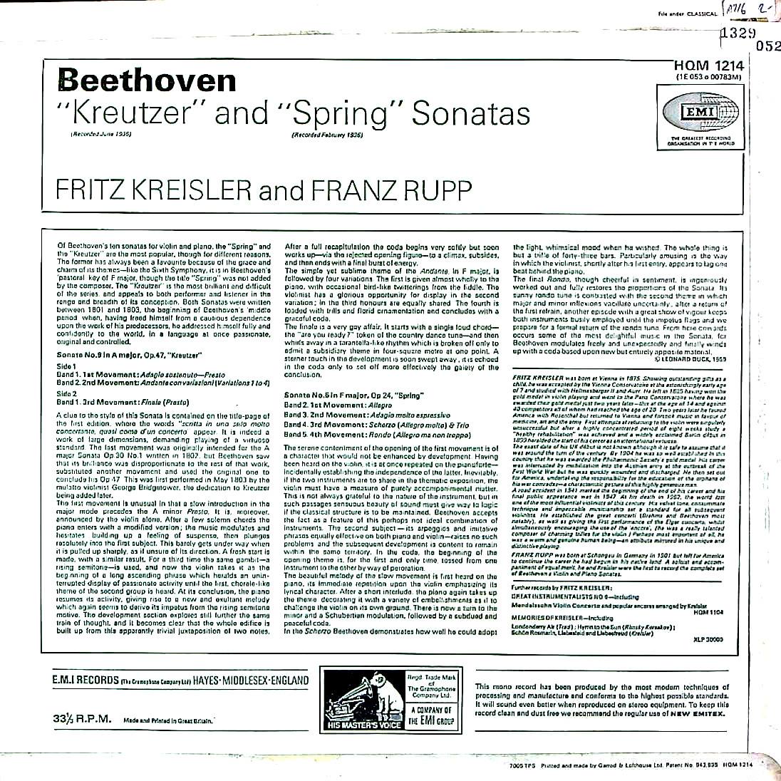 商品コード:1329-052[HMV] F.クライスラー(vn) F.ルップ(pf) / ベートーヴェン:Vnソナタ9番「クロイツェル」, 5番「春」