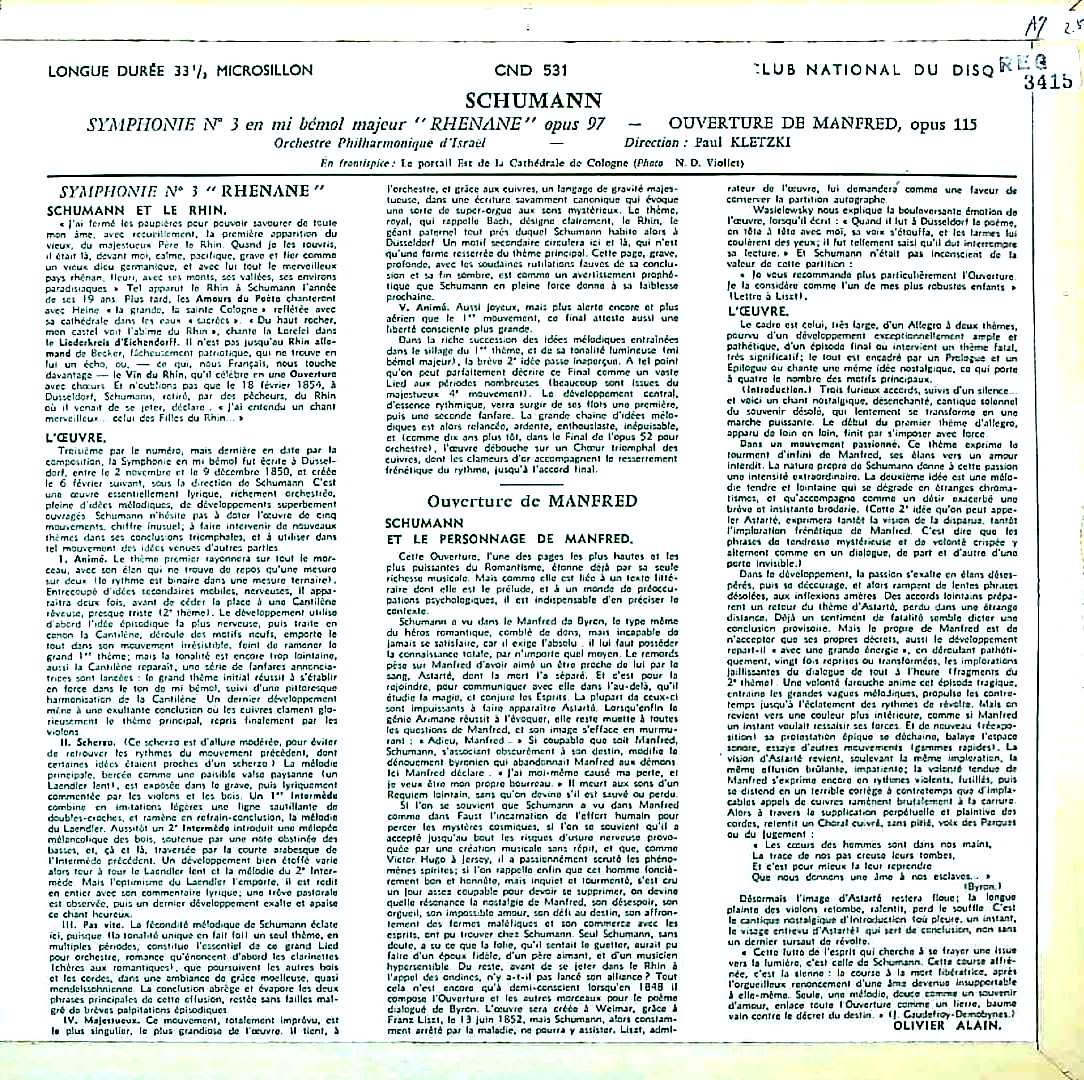 商品コード:REG-3415[仏Club National de Disques] P.クレツキ指揮/ シューマン:交響曲3番「ライン」, マンフレッド序曲