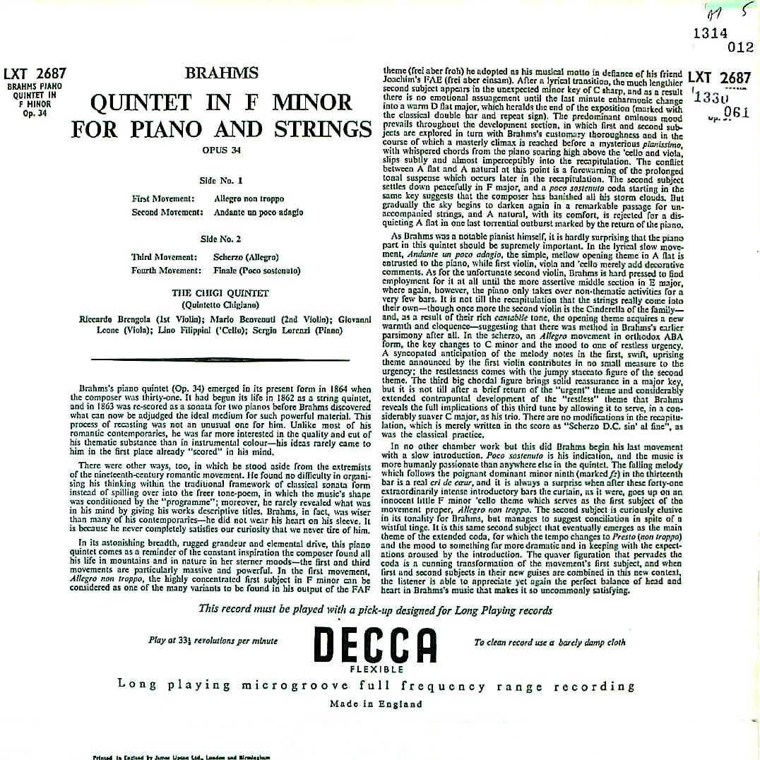 商品コード:1330-061p[DECCA] キジアーノPf五重奏団/ ブラームス:Pf五重奏曲