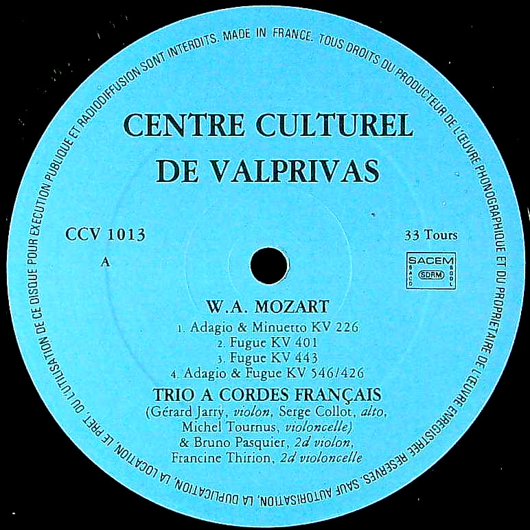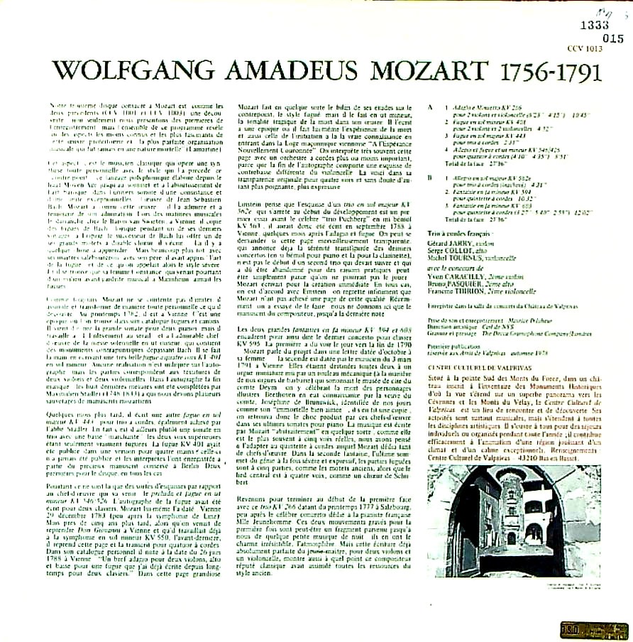 商品詳細:これはCentre Culturel De Valprivasレーベルのオリジナル録音。モーツァルトファンにとっては珍品中の珍品。フランス弦楽トリオによる弦楽三重奏を基本に演奏される。弦楽四重奏曲作品では第2Vnとして Y.カラシリ(vn)、第2VaとしてB.パスキエ(va)、第2VcとしてF.ティリオン(vc)が曲により参加している。B面の2つの自動オルガンのための「幻想曲」は弦楽5重奏版に編曲されたものが用いられる。曲も珍しいが演奏がDFで活躍したあのジャリ率いるフランス・トリオとあって演奏は折り紙付きである。曲を見ていくと、K.266はこの録音しかなさそうな単一楽章の弦楽トリオ。Pf/Orgのためのフーガ ト短調K.401は元々ピアノまたはオルガンで演奏される断片曲の短いフーガ。この曲も弦楽三重奏版で演奏される。Orgのための3声のフーガ ト長調 K. 443も当然各声部を弦楽器に置き換えた編曲版である。K. 443はLP時代唯一の録音であると思われる。モーツァルトの珍曲集・編曲集の一つだが弦楽三重奏/弦楽四重奏/弦楽5重奏編曲作品集でもある。録音は、技師モーリス・プレシュール(Maurice Prêcheur)によって行われ、プロデューサーはアンドレ・シャルランの盟友であるカール・ド・ニが務めた。シャルランの関わりを感じさせる優秀録音。プレシュールに関する情報はないがシャルラン・スクールの一人ではないかと思われる。レーベルのCentre Culturel De Valprivasはフランス中南部のオートロワール県にあるコミューン、ヴァルプリヴァに本拠を構えるマイナーレーベル。その地に14世紀に建てられたヴァルプリヴァ城及び修道院にヴァルプリバス文化センターを創設した。創設メンバーはピアニストであるエレーヌ・サロメとアンドレ・シャルランの盟友であるカール・ド・ニである。非常に大規模な修復作業を必要とした建物の修復に取り組み、カール・ド・ニはここの修道院長となった。 2人は1901年の法律に基づく協会の形で文化センターと音楽学校を設立した。大ホールでは演奏会や録音が行われ、Centre Culturel De Valprivasのスタジオとしても機能している。協会は2010年に解散した。Centre Culturel De Valprivasは1972年頃からLPをリリースしており、録音の良さと、企画の良さから人気のレーベルとなっている。カール・ド・ニが大半のプロデュースを行い、プレスはPathé、または別のプレス会社に委託していた。CCV 1013は1978年に当地で録音され発売された。