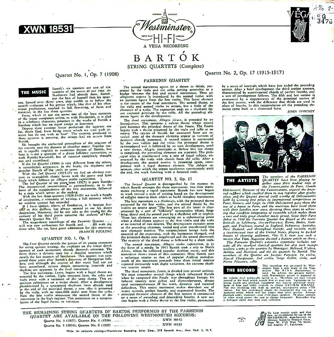 商品コード:REG-3476[米WESTMINSTER] パルナンQt. / バルトーク:SQ1, 2番
