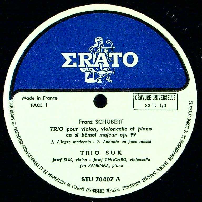 商品詳細:チェコのSUPRAPHONから発売されていたSUA 10624/SUAST 50624と同一音源のフランス・プレスである。ERATOはいきさつは不明だがSUPRAPHONと提携関係があり、お互いに音源を融通していた。もっぱらERATOがSUPRAPHON音源をテープでの提供を受けて自社製造するということが殆どであった。例を上げれば、チェンバロのルージチコヴァーの場合は何方でも録音を行っており、1970年代中期にはプラハとパリの両方で約半々程度録音したバッハの鍵盤作全集をERATOから豪華カートンケースで発売している。SUPRAPHONではこのような全集セットは発売されなかった。スーク・トリオの当音源はチェコでの1964年頃の録音でSUPRAPHONからは1965年にモノラル/ステレオで発売されたが、ERATOでは1968年頃ステレオのみがライセンス製造された。当時スーク・トリオは国際的にも重要な団体と認識されていたようである。ヨゼフ・スーク(1929 - 2011)も故人となってしまった。スーク・トリオは少なくとも1957年頃に結成されたようで、メンバーはピアノ:ヤン・パネンカ( 1922 - 1999)、ヴァイオリン:ヨゼフ・スーク(1929 - 2011)、チェロ:ヨセフ・フッフロ(1931-2009)で創設され、1980年代までは活動していたと思われる。今では全員亡くなってしまった。3人共にチェコ生まれの音楽家であり、それぞれがソリストとして大きな名声を博した音楽家たちである。米国に代表される音楽ビジネスを主体としたトリオとは一線を画す、純粋に音楽の愉しみを与えてくれる団体であった。1970年代に入ると、スーク・トリオのような団体は絶滅危惧種となってしまう。その危惧は的中し、1970年代に立ち上がった団体にもはやスーク・トリオのような音楽性を感じることはなかった。だからERATOも大量のSUPRAPHONの中から僅かなライセンス製造の一つに選んだに違いない。本国より3年程度遅れてのプレスだが、ERATOでマスタリングからプレスまで全て管理されたフランス盤である。