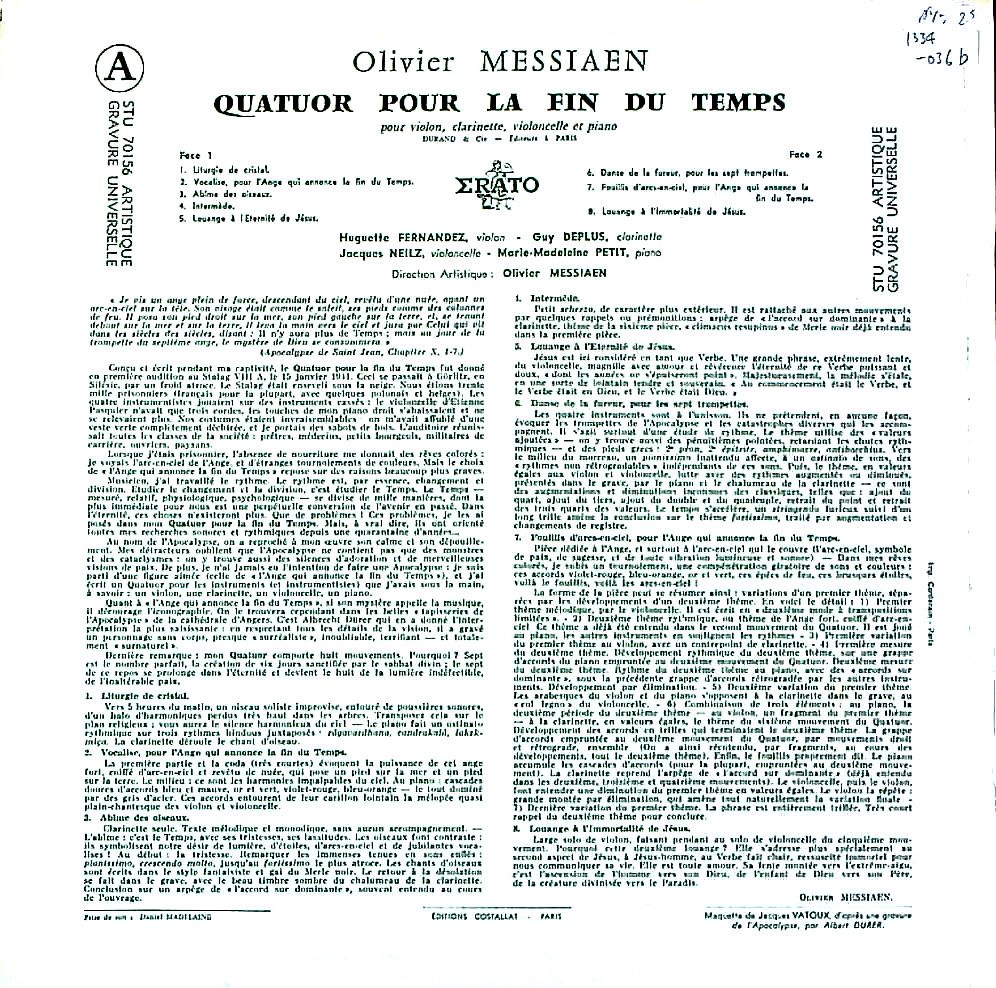 商品コード:1334-036b[ERATO] H.フェルナンデス(vn) G.デュプリュ(cl) J.ネイルス(vc) M.M.プティ(pf) / メシアン:世の終りのための四重奏曲