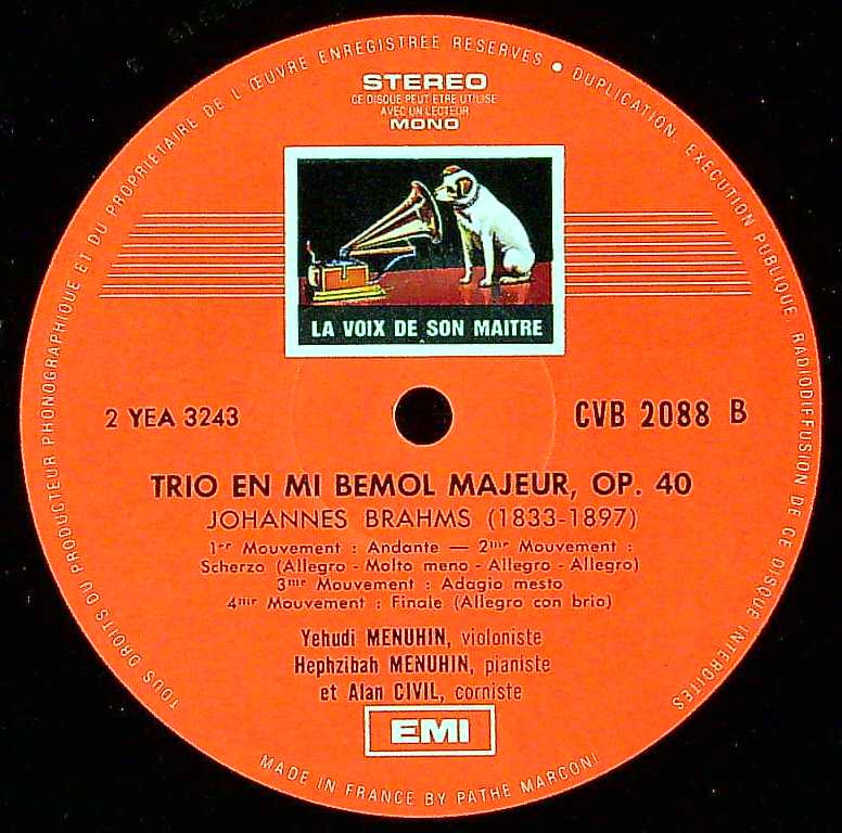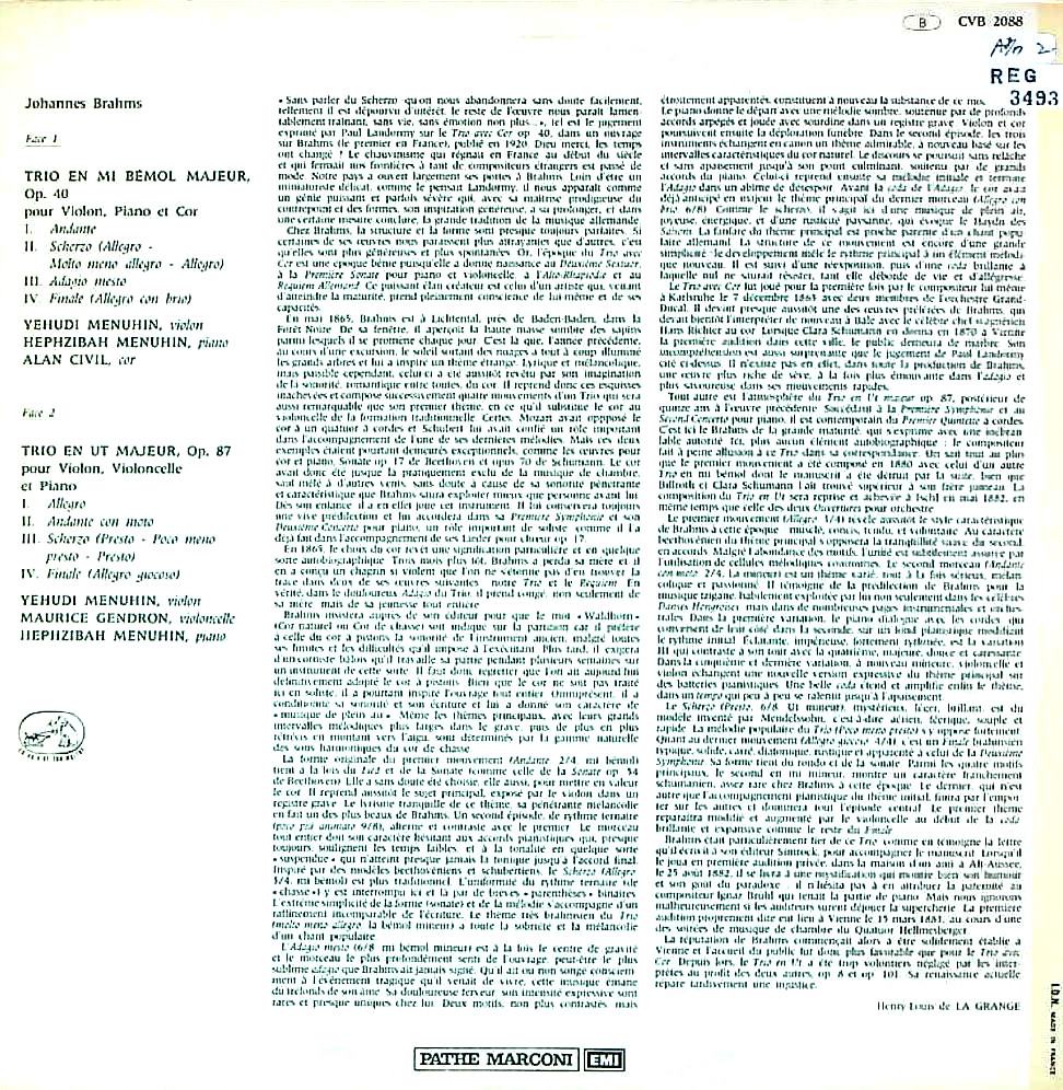 商品コード:REG-3493[仏VSM] Y.メニューイン(vn) H.メニューイン(pf) A.シヴィル(hr)/ ブラームス:Vn・Hr・Pfトリオ, Pfトリオ2番