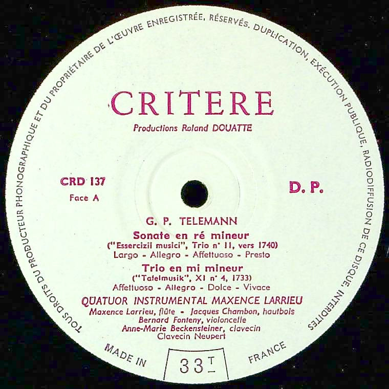 商品詳細:Critèreは1950年代後期に音楽プロデューサーRoland Douatteにより設立されたフランス・マイナーレーベル。1960年頃からレコード発売がスタートしている。どれも拘った高音質録音でモノラルといえどもかなりのHi-Fiサウンドである。プレスは全て仏PHILIPSの工場に(Société Phonographique Philips)に委託製造していた。録音技師の名前は明かされていないが、アンドレ・シャルランクラスの技師が関与したのは間違いがない。プロデュースは殆どRoland Douatte自らが行い、音楽性や音質は高品質に管理されている。その為カタログのタイトルは少ないものの、バロック作品を中心とした独自の企画で他のレーベルにはない優れた内容のLPを世に出していた。これはフルートのマクサンス・ラリューがフルートでテレマンのソナタ2曲とトリオ・ソナタ2曲の4曲の室内楽を収録したLP。1964年頃の発売と思われる。マクサンス・ラリュー(1934-)はフランス・マルセイユ生まれのフランスのフルート奏者。10歳でマルセイユ音楽院に入学、ジャン=ピエール・ランパルの父であるジョセフ・ランパルにフルートを学ぶ。 1958年、国際ジュネーブ国際音楽祭で最優秀賞を受賞。パリ・オペラ・コミック、パリ・オペラ座管弦楽団、リヨン国立高等音楽院、ジュネーブ音楽院教授を歴任。1951年にジュネーブ国際コンクールで第1位を受賞。彼は1954年から1966年までパリ・オペラ座管弦楽団で演奏し、その後1978年までパリ・オペラ座管弦楽団で演奏した。1970年にはアンサンブル・バロック・ド・パリでジャン=ピエール・ランパルの後任を務め、ジャン=フランソワ・パイヤールシャンブル管弦楽団で多くの録音を行った。これらの職に加えて室内楽奏者としても活動し、録音は様々なレーベルに多岐にわたる。ランパルの12歳下だが1960年頃から録音を開始して、出したLPは相当数に上る。Erato、Philips、EMI系への録音が大半だがこれは中でも異例のCRITĒRE録音。CRITĒREへはフルート奏者として脇役で参加のLPは数点あるが、このようなリーダーアルバムの録音は唯一となる。評判通りの高音質録音で、M.ラリュー器楽四重奏団としての纏まりの良さも聴ける初期録音!ラリューのフルート共にジャック・シャンボンのオーボエもまた聴きもの。テレマンは現在TWV番号で分類されるがジャケットの表記だけでTWV番号まで辿り着けた曲は2曲だけである点が残念!