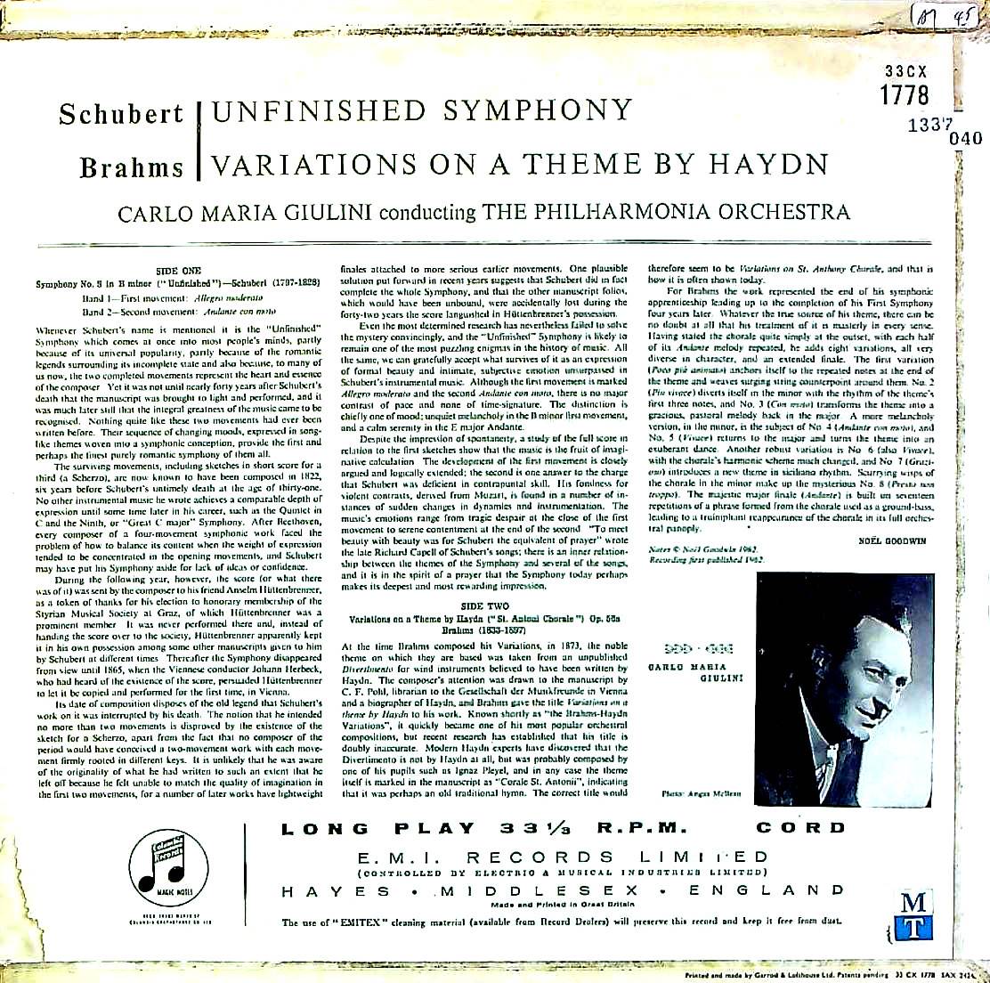 商品コード:1337-040[COLUMBIA] C.M.ジュリーニ指揮/ シューベルト:交響曲8番「未完成」, ブラームス:ハイドン変奏曲