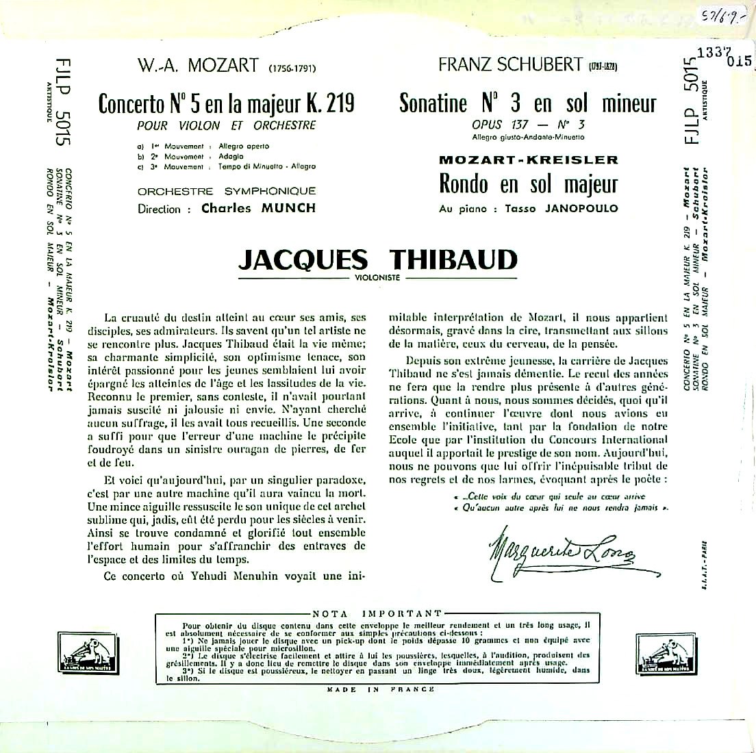 商品コード:1337-015[VSM] J.ティボー(vn)/T.ヤノポウロ(pf) / モーツァルト:Vn協奏曲5番, シューベルト:Vnソナタ3番, クライスラー:ロンド