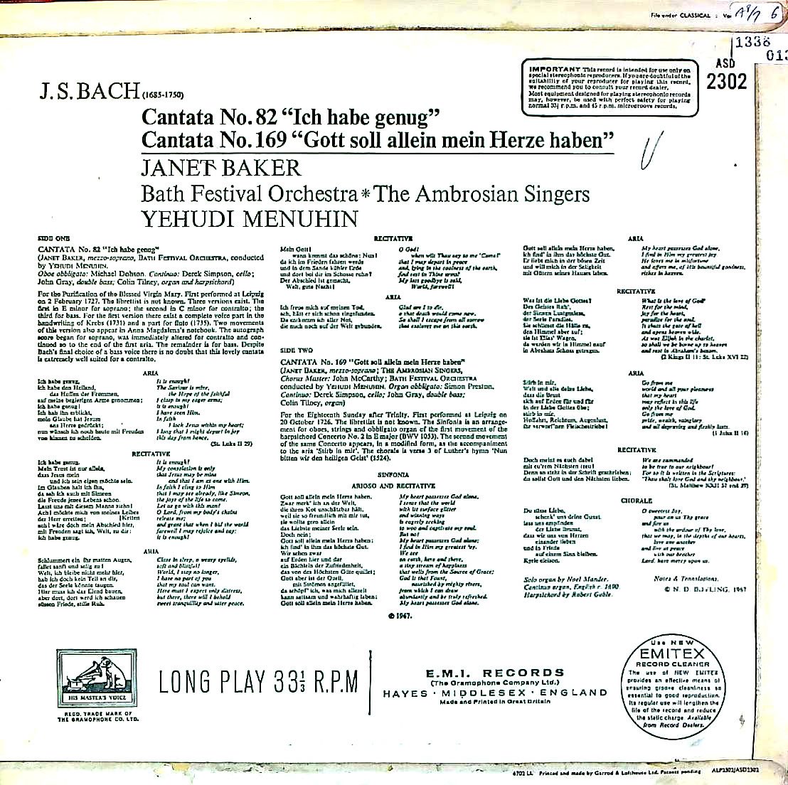 商品コード:1338-013[HMV] J.ベイカー(ms) Y.メニューイン指揮/ バッハ:カンタータ 82, 169番