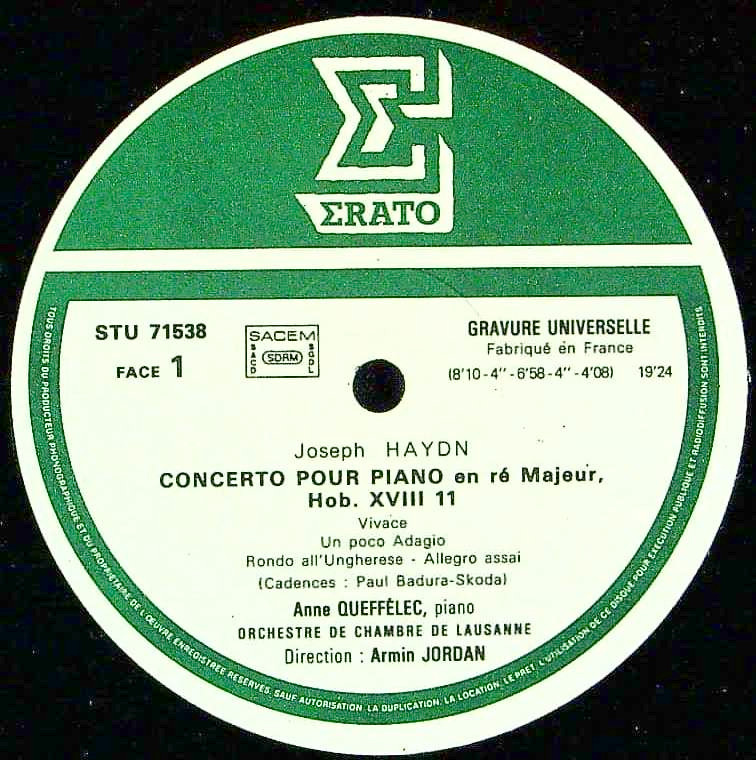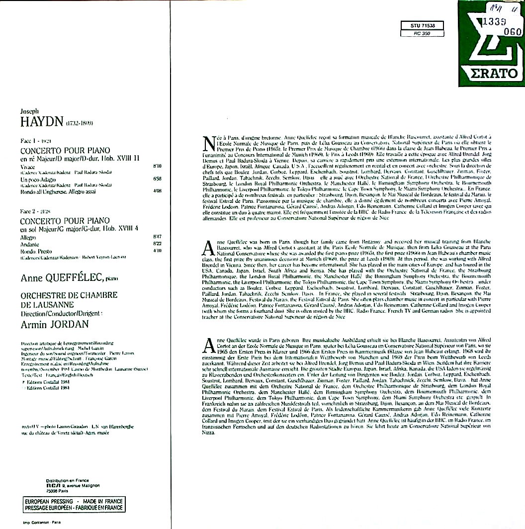 商品詳細:アンヌ・ケフェレック(1948-)パリ生まれ。彼女は日本でも人気がある。デビューは1970年だが、当時から注目されていたピアニストだった。パリ音楽院卒業後、ウィーンでバドゥラ=スコダ、デームス、ブレンデルに師事する。1968年ミュンヘン国際音楽コンクールで審査員満場一致で優勝、翌年リーズ国際ピアノ・コンクールでも入賞を果たし、一躍ヨーロッパで注目を浴びた。日本で毎年開催される「ラ・フォル・ジュルネ」のメイン・ゲストとして大活躍している。フランス政府より芸術文化勲章オフィシエを受勲。ソロ録音は全部でERATOに5種、RCAに1種。Pf協奏曲は4種(フンメル/ラヴェル/ハイドン/バッハ)と思われる。未だ健在で2017年4月には銀座でコンサートを行った現役の仏ピアニスト。。これは彼女が1981年スイスで行った録音。アナログとデジタルの2種のLPが発売。曲は2つともCemb協奏曲をPf用に編曲したもので、Pfで演奏されるホーボーケン11番は最もメジャーなハイドン:Pf協奏曲で、最も録音が多い。早めのテンポのオケにCembを意識したかのようなソロが絡む。部分的にアクセントを利かせ、単調さは皆無。4番は逆にしっとりと聴かせる。プレスはアナログとデジタルの2種が用意された。これはアナログ版。デジタル版は頭にNUMが付く。ケフェレックのソロは優美であるのは勿論だがオケに負けないパワーも有する。ハイドンの協奏曲はピアニストによりその雰囲気を大きく変える曲である。この録音では全てがフランス色に染まる。独特の陰影のあるソロは深みも感じさせる。特にマイナー作品である4番が曲も良く、完成度の高さを見せる。迷いなくパンチの強さでオケを圧倒して、自身の世界を作る様子はメジャーな11番を完全に凌駕した演奏。B面の4番に注目されたい!