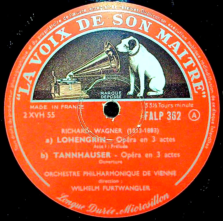 レーベルタイプ:【フランスでの当番号のオリジナル】---銀大ニッパー内溝, 9時にMade in France, 3時に33 1/3 Tours Minute, 6時に Longue Durée Microsillon, フラット重量, 表記されたレコード番号:FALP 362, Price Code:Ⓐ, Rights Society:記載なし, (P)なし, スタンパー/マトリクス:2XVH 56 21 /2XVH 55 21(ストレート小文字スタンパー・EMI/Pathéタイプ), EMIグループのオーストリア録音モノラル製造を示す2XVH***で始まりレコード番号を含まないフランス型フランス専用スタンパー使用, 補助マトリクス:ストレートMスタンパー・M6 170072/M6 170071, 再補助マトリクス:なし・パテキュラー(Patéculaire)はなし, ストレート本体とストレートMスタンパーの2種併存のPathéプレス, 1950年代のスタンパーによる1955年頃製造分, Disques Incassable付フラット盤は存在せず, 銀大ニッパーレーベルフラット盤の初期分(ツヤタイプ存在するか不明), これより古い仏レーベルは存在せず(タンホイザーのみFALP 289(ワーグナー序曲集)が初出), フランスでの最古レーベル・最厚プレスである(タンホイザー以外), フランスで更に古いマトリクス存在せず(英国型が存在するが順序は不明), ステレオ存在せず, RIAAカーヴではない, EMIグループのオーストリア音源のLa Voix De Son Maître製作Pathéプレス, 工場:Pathé Marconi EMI, Chatou, フランスでのオリジナル・タイプ, original type in Fr.