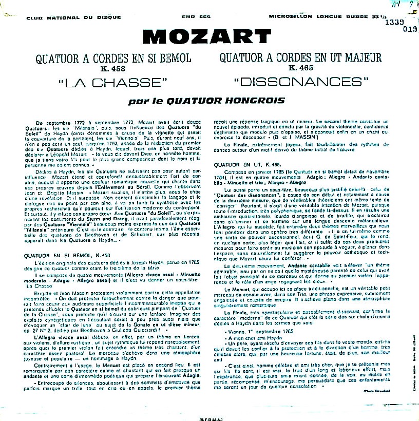 商品コード:1339-019p[CLUB NATIONAL] ハンガリーQt. / モーツァルト:弦楽四重奏曲17番K.458「狩」, 19番K.465「不協和音」