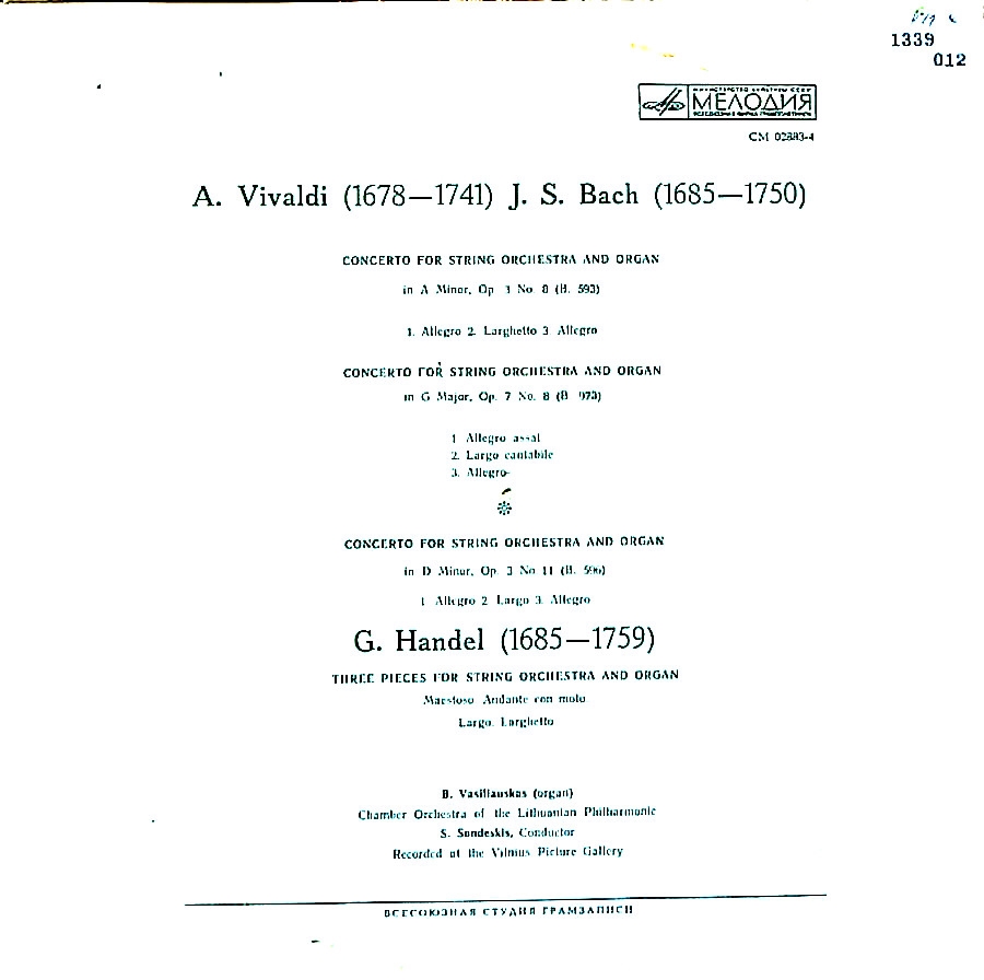 商品コード:1339-012n[MELODIYA] B.ヴァシリャウスカス(org)/ バッハ:Orgと管弦楽のための協奏曲(3曲), ヘンデル:Orgと管弦楽のための3つの小品