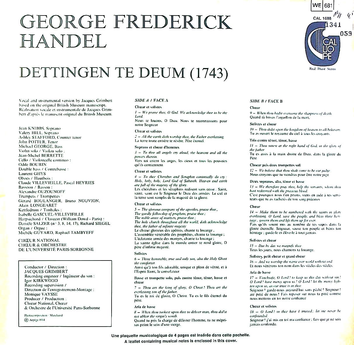 商品詳細:ヘンデルの「デッティンゲン・テ・デウム」はヘンデルが1743年に作曲した教会音楽。ヘンデルは『ユトレヒト・テ・デウム』(1713) や『シャンドス・テ・デウム』(1720頃) など、いくつかのテ・デウムを書いているが、その中で最もよく知られる作品である。「テ・デウム」とは、キリスト教のカトリック教会・ルーテル教会、正教会、聖公会の聖歌の一つ。テクストの冒頭の一文“Te Deum laudamus"(われら神であるあなたを讃えん)からこの名称で呼ばれる。曲種としてはイムヌス(賛歌)に分類される。聖務日課の「朝課」(真夜中の祈り)の最後に歌われることが多い。「デッティンゲン・テ・デウム」は1743年6月27日のデッティンゲンの戦いでジョージ2世が勝利したことを記念して作曲された。戦勝祝賀行事で初演されたが、大変に盛大な音楽で、高く評価された。歌詞は聖公会祈祷書の「Te Deum Laudamus」による。ソプラノ2、アルト、テノール、バスによる混声5部合唱で、一部の曲に独唱がある。管弦楽にはトランペット3、ティンパニ、オーボエ2、ファゴット、弦、通奏低音を含む14曲構成。ヘンデル作品の中でも屈指の傑作といえる曲で声楽としてだけでなく、勇壮な教会音楽としての地位は不変のものがある。オリジナルは英語歌詞で、当盤はオリジナルの英語で歌われる。音質も大変良い! 指揮のジャック・グリベール(1929-?)はイルドフランス地域圏のオードセーヌ県コロンブの生まれ。リール音楽院でトランスバース・フルートを学んだ後、パリ音楽院に入学し、オリヴィエ・メシアンやダリウス・ミヨーなどに師事した。彼は 1974 年にパリ・ソルボンヌ合唱団とオーケストラの創設者であり、 2008 年までソルボンヌ音楽院の芸術監督を務めた。合唱団監督兼指揮者として活躍した。この録音も自身が創設したパリ・ソルボンヌ合唱団とオーケストラを使っている。録音は少ないがグリベールは2003年合唱指揮者、作曲家として芸術文化勲章司令官の名誉勲章を受けた。これはパリ・ソルボンヌ大学の講堂で録音された。昔カザルスが同じ場所でフォーレなどの録音をした場所と同じ。
