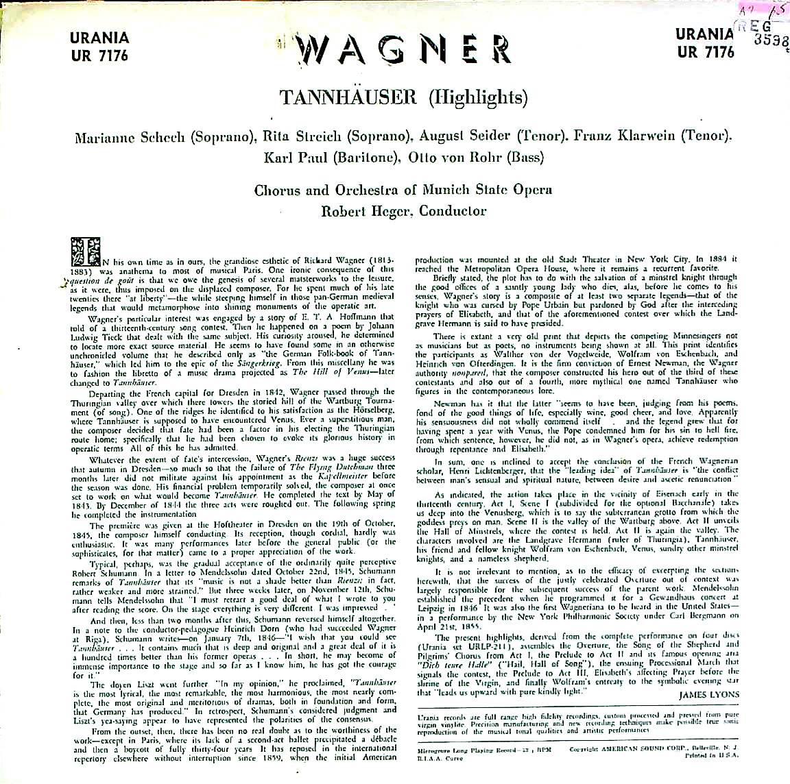 商品コード:REG-3598t[米URANIA] R.ヘーガー指揮/ ワーグナー:歌劇「タンホイザー」(ハイライト)