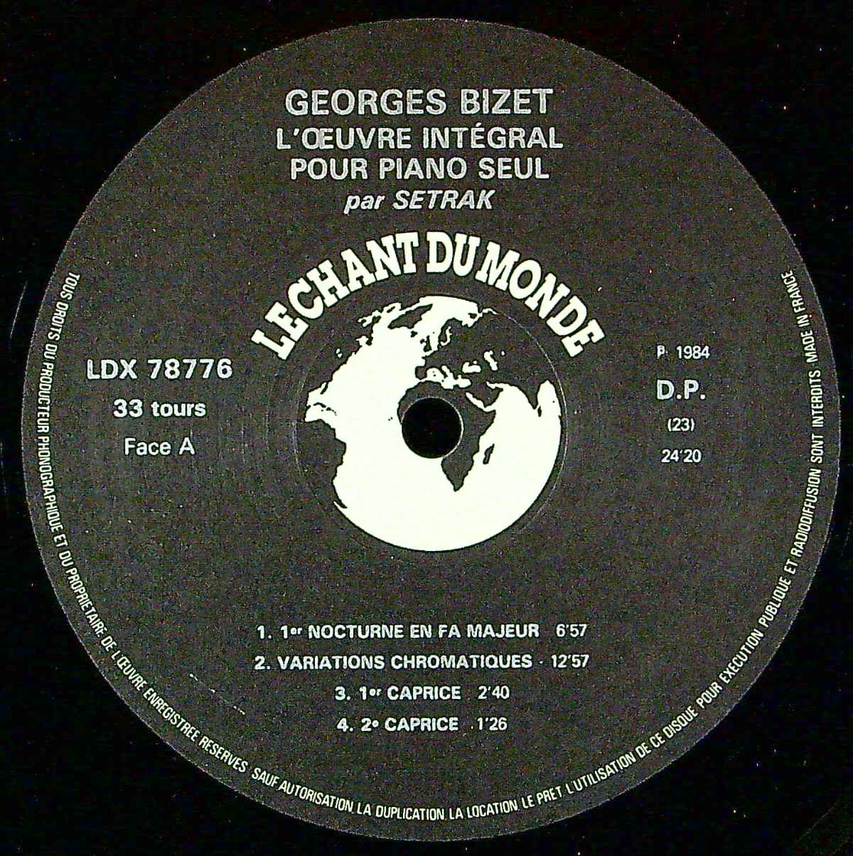 商品詳細:ピアニスト、セトラック・ヤブルヤン(1930-2006)はトルコ・イスタンブールで生まれのアルメニア人。最初本名で1958年に仏マイナー・レーベルPICTUREに録音した「展覧会の絵」で鮮烈なデビューを果たし、1967年フランスに帰化、名前もSETRAKに改名した。デビューLPの「展覧会の絵」は知る人ぞ知る「展覧会の絵」の傑作録音。その後17年間録音が無く、1970年代中期になって再び活動を開始したピニスト。再始動時に改名し、セトラックだけで表記するようになった。アルメニア系であることを意識させないイメージ戦略だろう。1975年にLa Voix De Son Maître、1980年頃からSOLSTICE、Le Chant du Mondeなどに録音を再開した。セトラックはパリでコルトー、ロンに師事した正統派で、リストの伝統を受け継ぐ技巧派のピアニストだ。彼のクリスタルな硬質で透明度の高い音をシャン・デュ・モンドもよく捉えていて、このビゼーのピアノ曲という珍しい作品をお宝にできると信じる。デビュー当時の技巧は健在で、ショパン、カバレフスキー、ブゾーニ、リストなど様々なレパートリーを披露した。当時の「展覧会の絵」を思い出させるロシアンスクールを彷彿とさせる切れのよいタッチが聴ける。どこかローカル色を残すあたりが彼の魅力でもある。Le Chant du Mondeがセトラックに目を付けたことは不思議さを感じる。長い沈黙の期間に相当に訓練を積んだのだろう。迷いなく降りかざす打鍵は爽快の一言に尽きる。セトラックが単に優れた技巧派ではないことは既に「展覧会の絵」で証明されており、この録音では更なる腕前の進歩と曲の多彩な表現力を身に付け、幅の広いピアニストとなって現れた。それが真実だろう。硬質なタッチを意図的に使いビゼー的世界を表現している。曖昧さの全くない切れ味鋭い演奏。「展覧会の絵」で感じた音を包丁でみじん切リにしたような個性はここで進化した形を見せる。超が付くような辛口スタイルに徹している。ビゼーのピアノ作品という超が付くマイナー作品集で殆どの方が初めて聴く曲だろう。しかし、針を落とせば、ぐいぐいと引き込まれるセトラックの魔術にはまることになる。一種豪華であり、また悪魔的な魅力で聴く者を翻弄する不思議なピアニスト。1980年代に入っての録音だが心配はいらない、1970年代と変わらない高音質録音である。エコー分はほぼ感じないリアルな音である。まるでリストを聴いているような印象。只ならぬ気配が常に付きまとう、ある種危険なLPである。