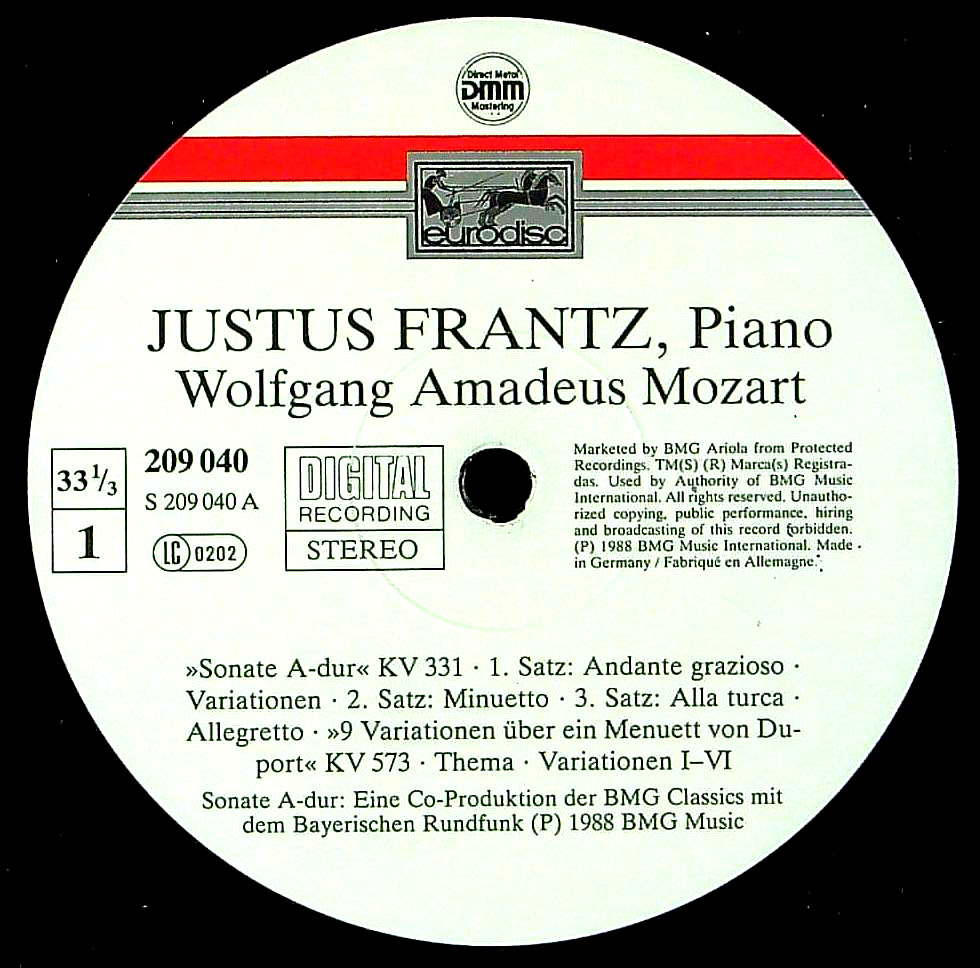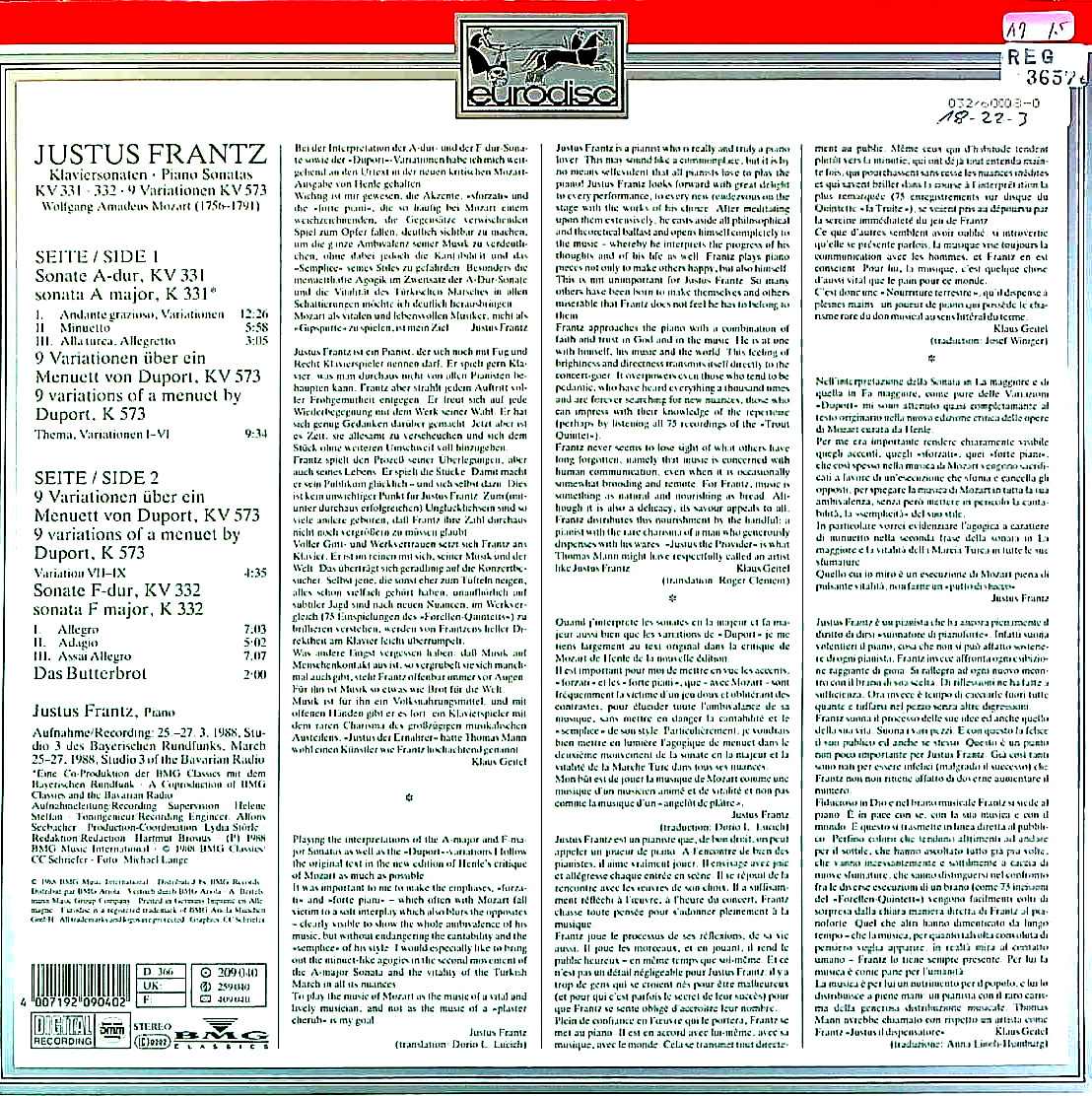 商品コード:REG-3657t[独EURODISC] J.フランツ(pf) / モーツァルト:Pfソナタ11番K.331, 12番K.332, 変奏曲K.573