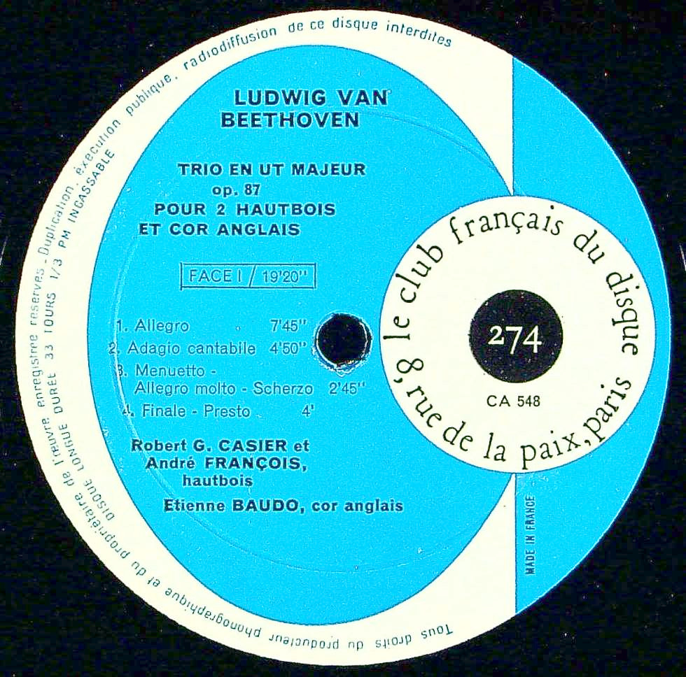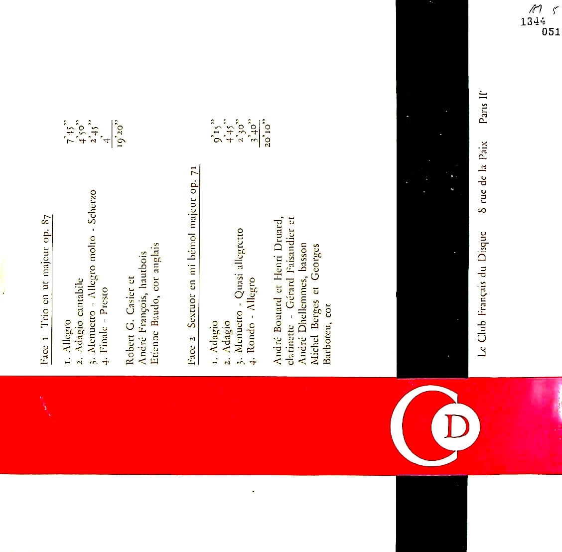 商品コード:1344-051[Club Français] R.G.カジエ, A.フランソワ(ob) E.ボド(E-hr) 他/ ベートーヴェン:Ob三重奏曲, 木管六重奏曲
