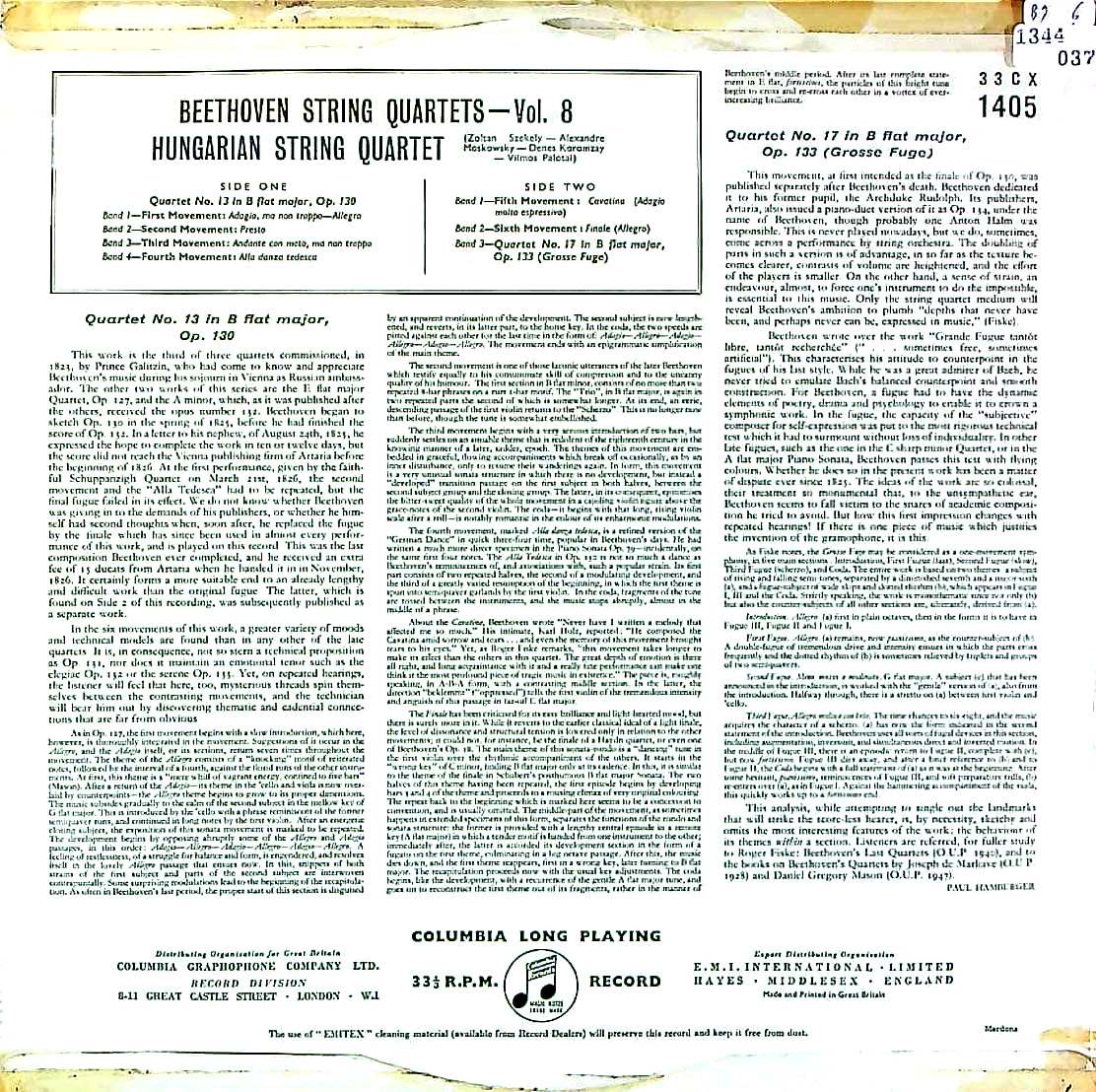 商品コード:1344-037[COLUMBIA] ハンガリーQt. / ベートーヴェン:弦楽四重奏曲全集-8/弦楽四重奏曲13, 17番「大フーガ」