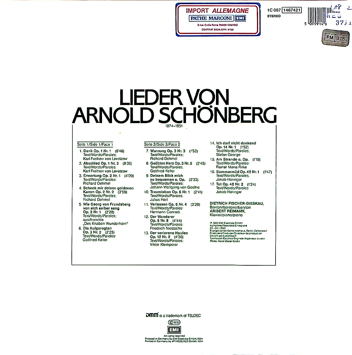 商品コード:REG-3711[独ELECTROLA] D.フィッシャー・ディースカウ(br)/ シェーンベルク:2つの歌 他(17曲)