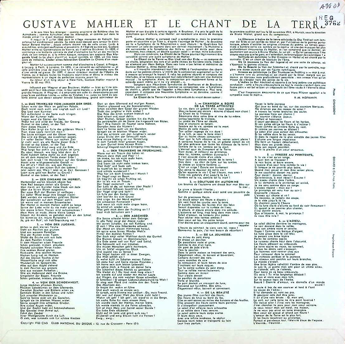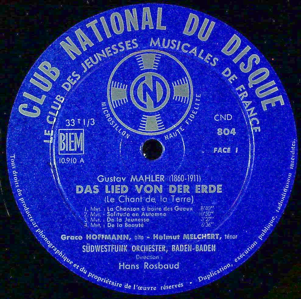 商品コード:REG-3762[仏Club National de Disques] H.ロスバウト指揮 G.ホフマン(a) H.メルヒェルト(t)/ マーラー:大地の歌