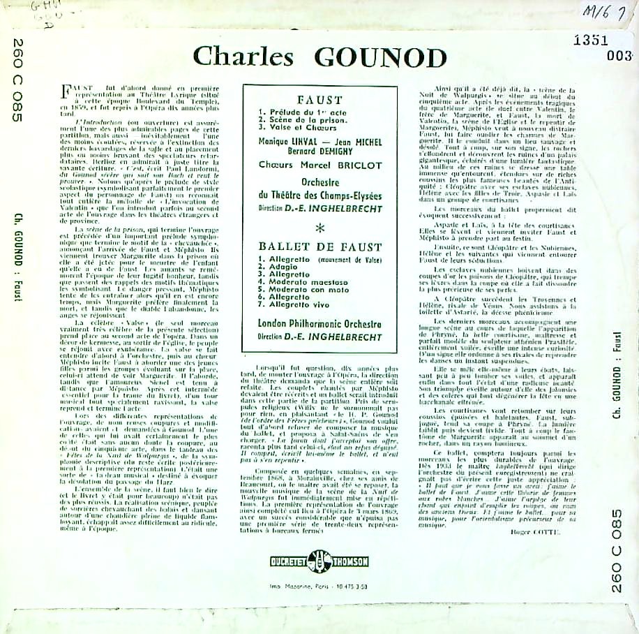商品詳細:1950年代のパリ(A面)とロンドン(B面)でのモノラル録音。グノーの歌劇「ファウスト」から~前奏曲,~牢獄の情景,~ワルツと合唱の3曲を抜粋したものがA面に入る。ここでは歌も入る。B面は有名な第5幕に入る「バレエ音楽」が全7曲入る構成。何故かB面の「バレエ音楽」はロンドンでロンドンpo.と録音している。全曲録音は存在せず、10"1枚分の抜粋録音のみである。アンゲルブレシュトのLPの中で最も入手困難な1枚である。B面の「バレエ音楽」は別の作品のような印象を受けるが、歌劇「ファウスト」の第5幕のワルプルギスの饗宴の場面に挿入される部分で、1859年パリのリリック座で行われた初演時にはなかった部分だが、1869年のオペラ座での上演に際し、当時のフランス・オペラの慣例に従って第5幕に追加されたものである。全曲版では省略されることもある。7つの部分で構成され、各曲は切れ目なしで演奏される。その後この「バレエ音楽」は単独で演奏されるようになる。またA面の3曲目の「ワルツと合唱」は、第2幕の終結部において、ファウストがマルグリートに近づこうとする場面で演奏される音楽である。単独でもしばしば演奏される。ピアノ、ヴァイオリン、合唱曲にも編曲されており、ピアノ独奏版はランゲ編曲やリスト編曲などが存在する。全曲録音はSP期からあり、最初の録音は1930年アンリ・ビュッセル指揮パリ・オペラ座管弦楽団で行われた。1948年にはトーマス・ビーチャム/ロイヤル・フィルハーモニー管弦楽団が英国で初録音している。1951年には米国で初録音が行われ、ファウスト・クレヴァ指揮メトロポリタン歌劇場管弦楽団であった。よく知られたアンドレ・クリュイタンス指揮パリ・オペラ座管弦楽団は1953年のフランスでのLP初回録音。1958年2回目の録音を同オケとモノラル/ステレオで行った。クリュイタンス以降は1966年のリチャード・ボニング指揮ロンドン交響楽団まで間が空く。アンゲルブレシュトは抜粋録音なので殆ど知られていない。この抜粋録音のメインはB面の「バレエ音楽」全7曲であろう。1950年代の前期の録音ではないかと思われる。Ducretet Thomson自体、歌劇の全曲録音は行わない会社なので仕方がない。アンゲルブレシュト自体、歌劇の録音は行わない指揮者であるのでこれは珍しい。また入荷の極めて少ない10"である。ファンにはかなりのレア盤!